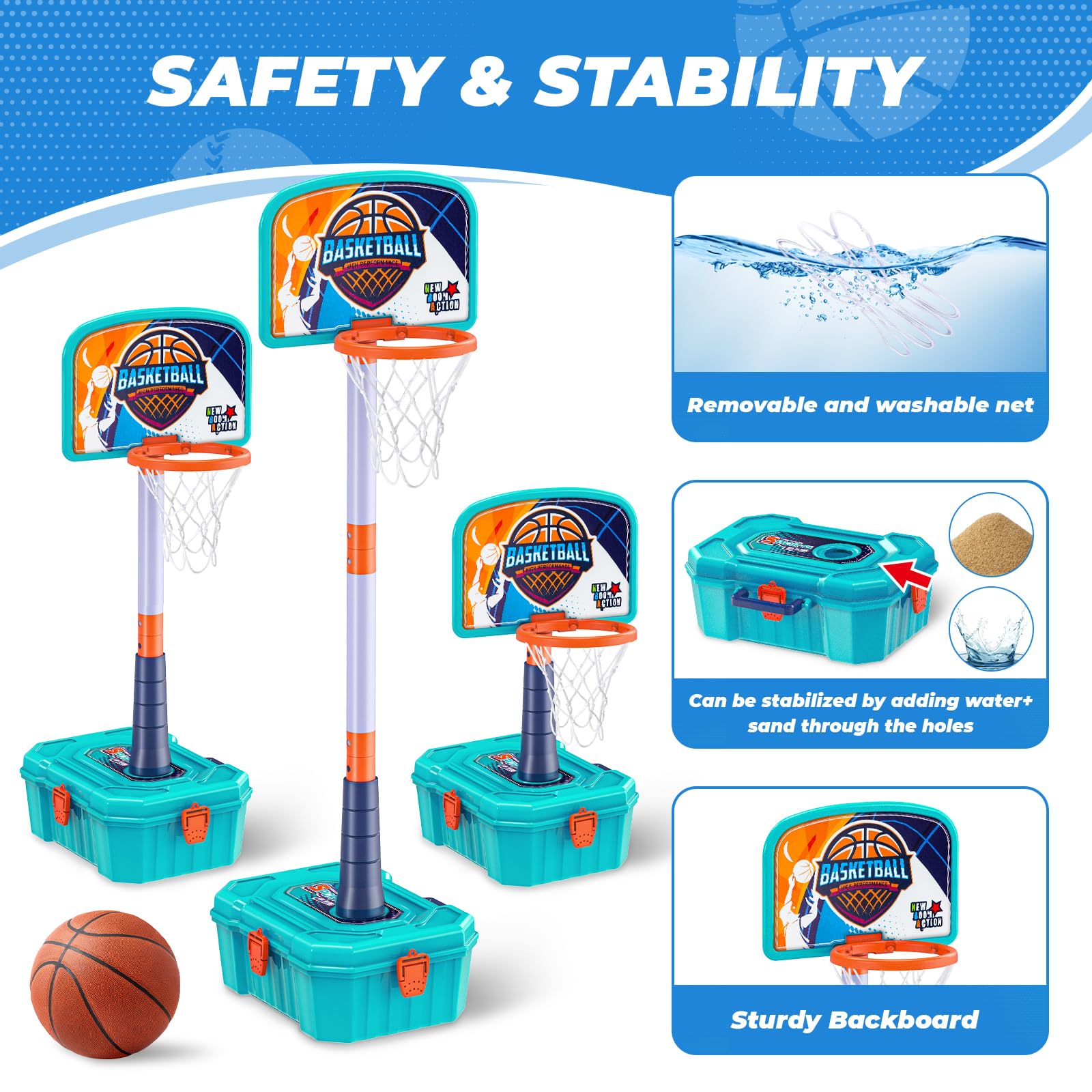 - Safe and Sturdy Design: Our 5 in 1 kids' basketball hoop and T-ball set are made of high quality ABS plastic, which is lightweight, easy to carry, and durable. You can add water or sand to the base and put a sandbag or other heavy objects on the base to increase stability. The stable base ensures a worry-free Play period for kids and toddlers. It is a great indoor & outdoor toy for kids ages 3+