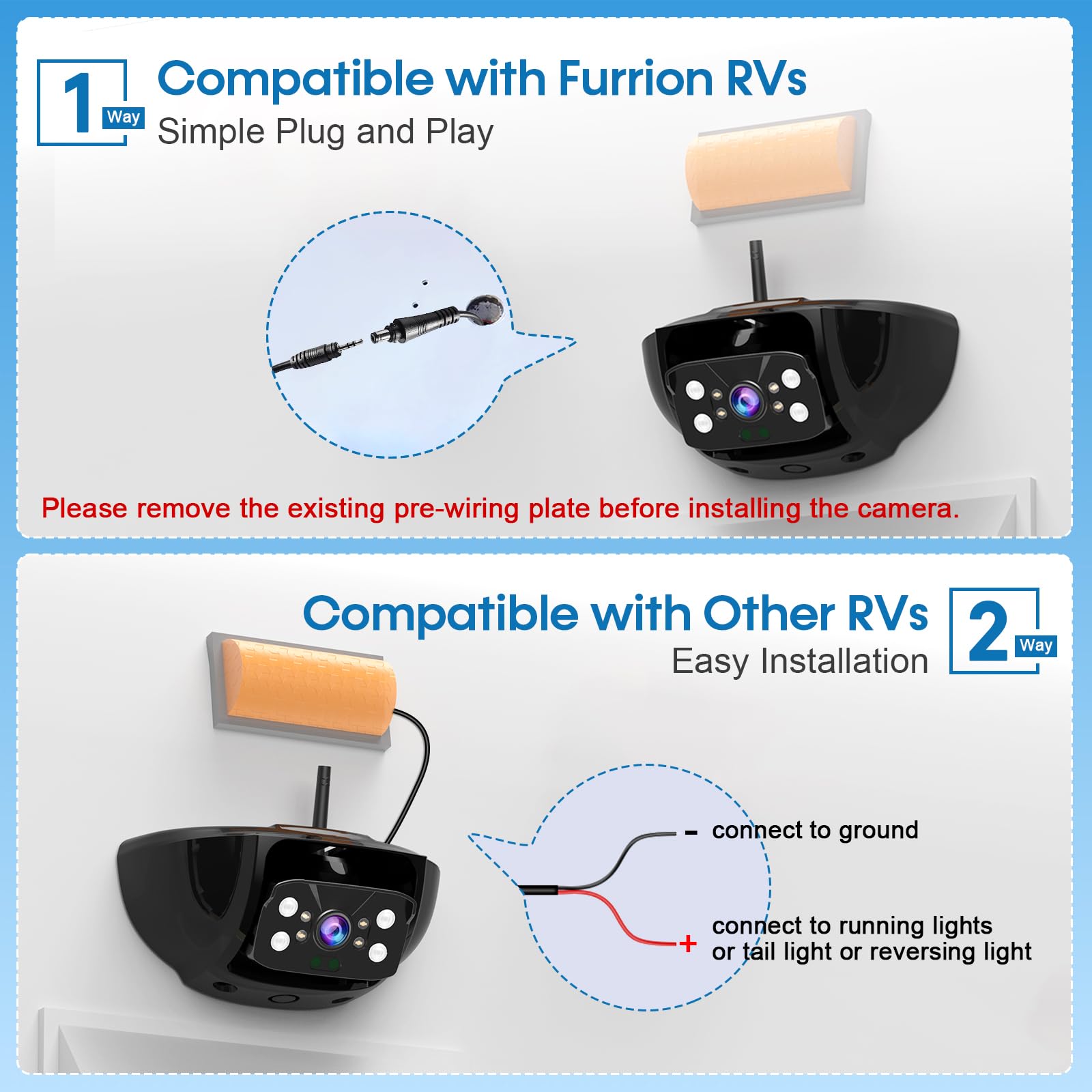 - Compatible with Furrion Pre-Wired RVs: Designed to seamlessly connect to Furrion pre-wired systems, offering quick plug-and-play installation. Also adaptable to various other vehicles, including trailers, trucks, and SUVs. Even if your vehicle is not pre-wired, the camera can be connected to a power source for back-up lights, running lights, marker lights, etc