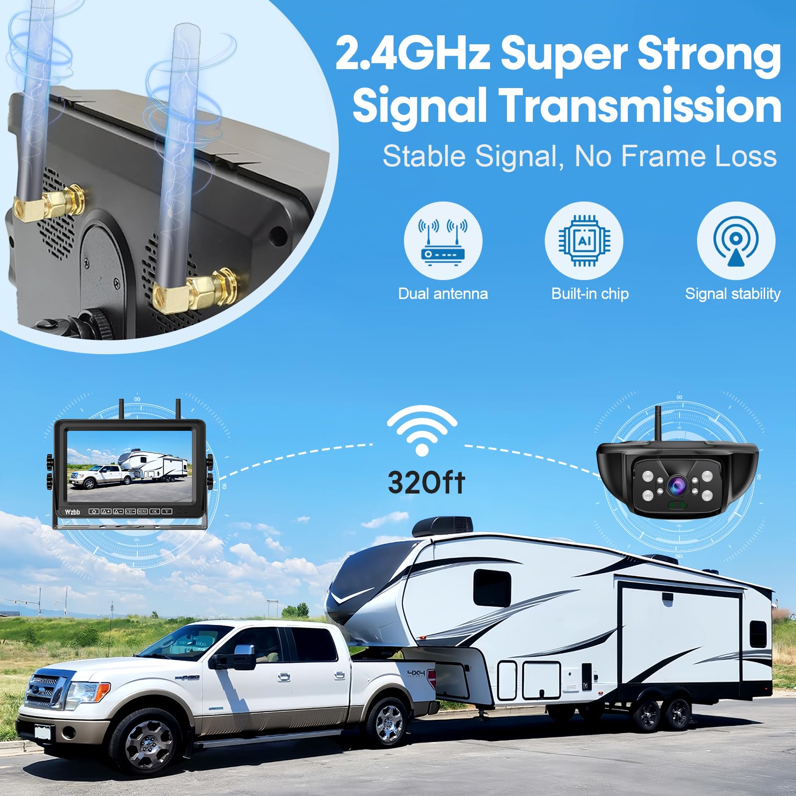 - Enhanced Digital Signal with Long Range: Utilizing 2.4GHz dual antennas, the system offers a stable, lag-free connection up to 825 feet in open areas and 320 feet in vehicle range, ensuring a smooth, clear image during any journey