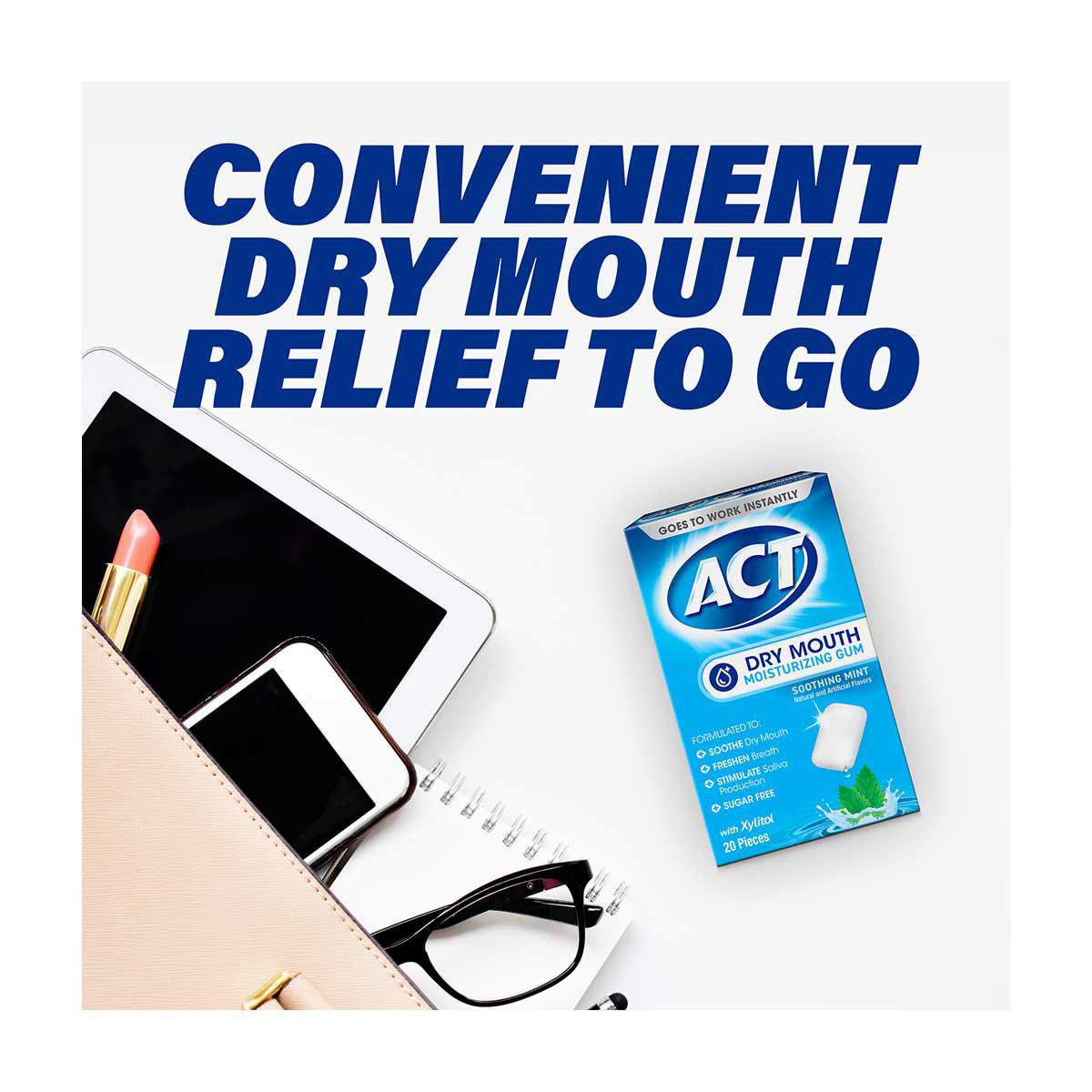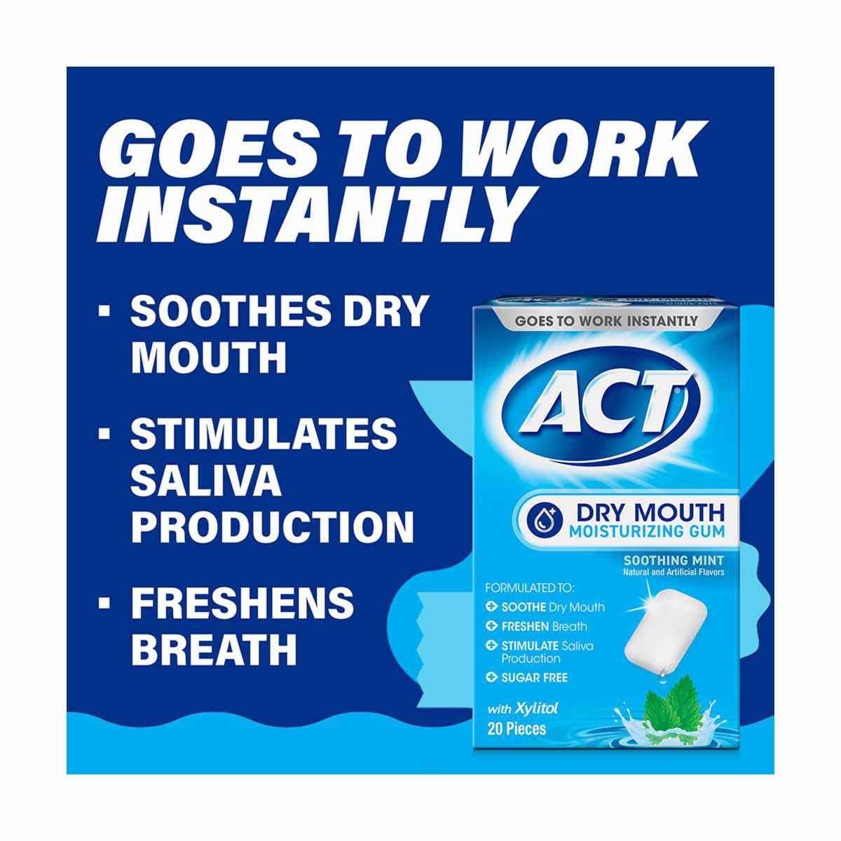 - Contains: One (1) 20-count pack of ACT Dry Mouth Moisturizing Gum, Soothing Mint