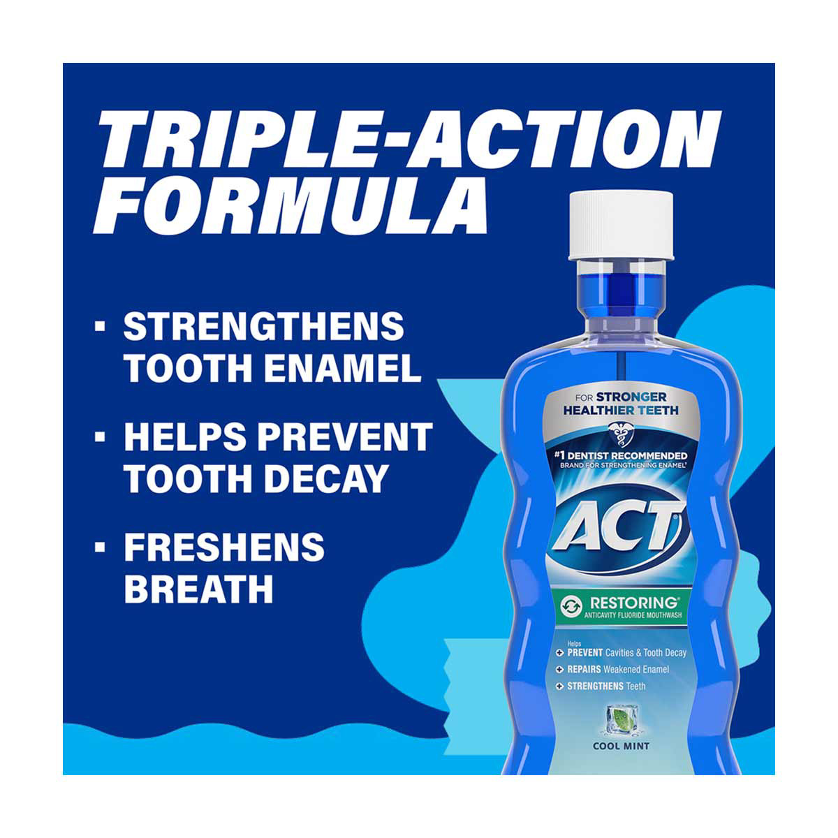 - Contains: One (1) 33.8-fluid-ounce bottle of ACT Restoring Anticavity Fluoride Mouthwash, Cool Mint