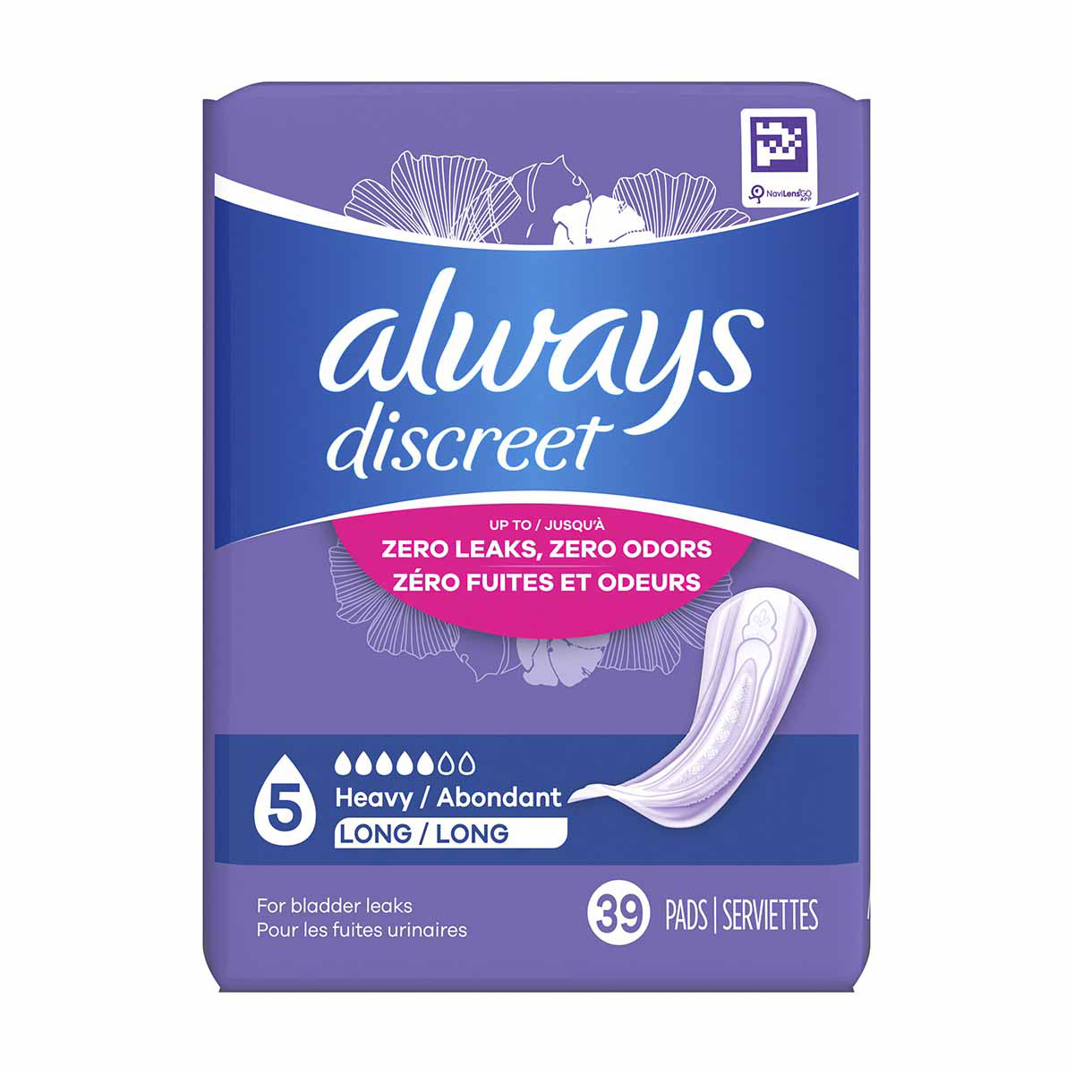 Always Discreet Adult Incontinence Pads for Women, Heavy Absorbency, Long Length, Postpartum Pads, 39 CT