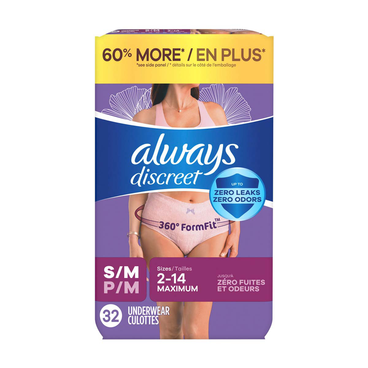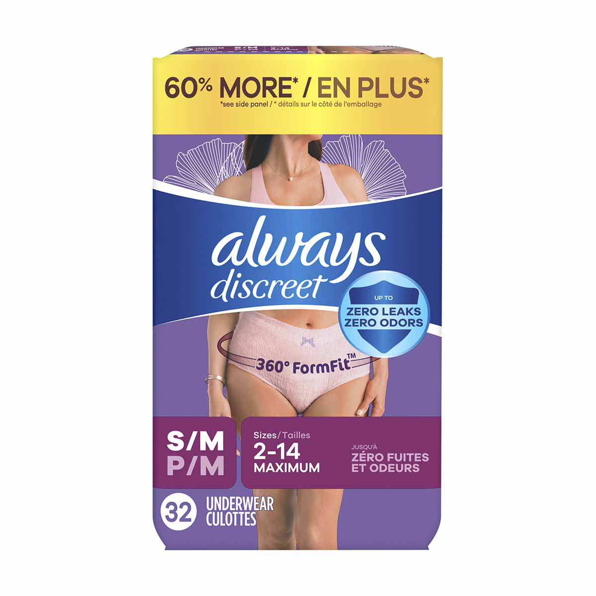 Always Discreet Adult Incontinence Underwear for Women and Postpartum Underwear, S/M, Up to 100% Bladder Leak Protection, 32 CT