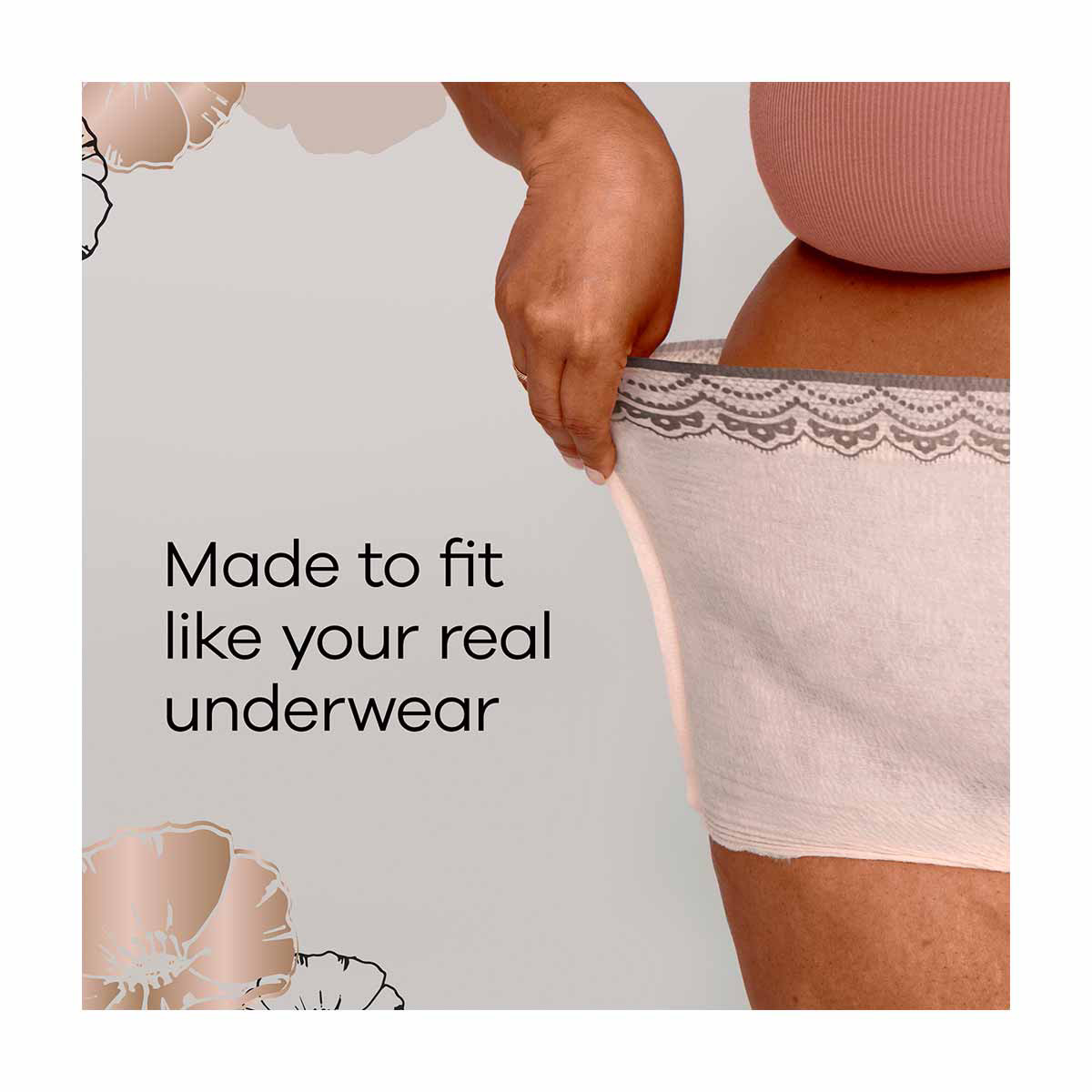 - Sleek pull-on incontinence underwear with breathable, soft silk-like material looks and feels like real underwear