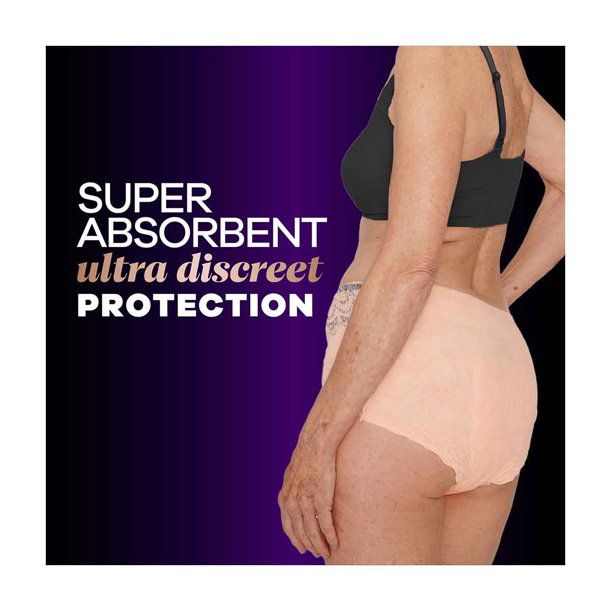 - Unique absorbent core turns liquid to gel to absorb bladder leaks in seconds