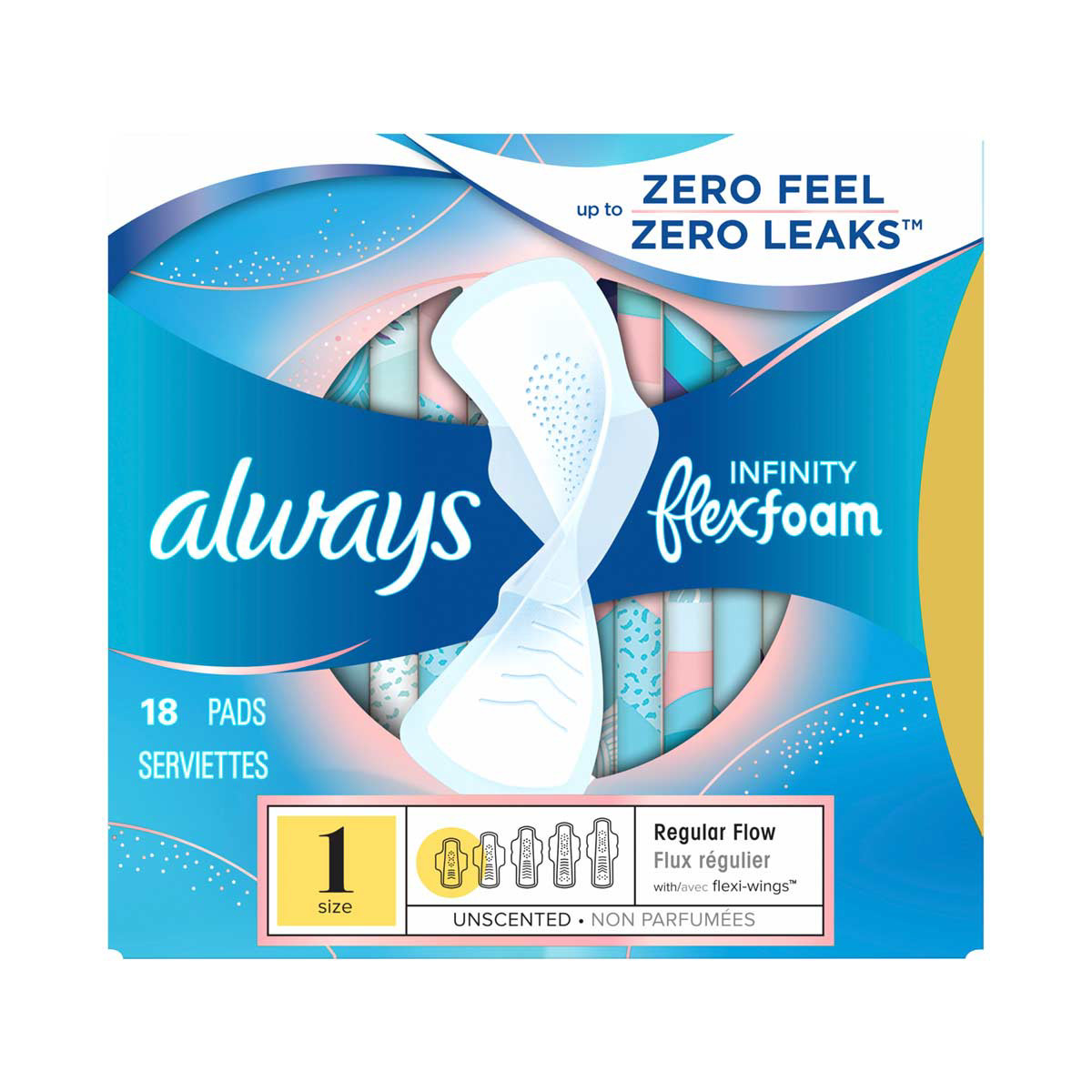 - Available as a size 1 for regular flow. Package of 18 pads with wings