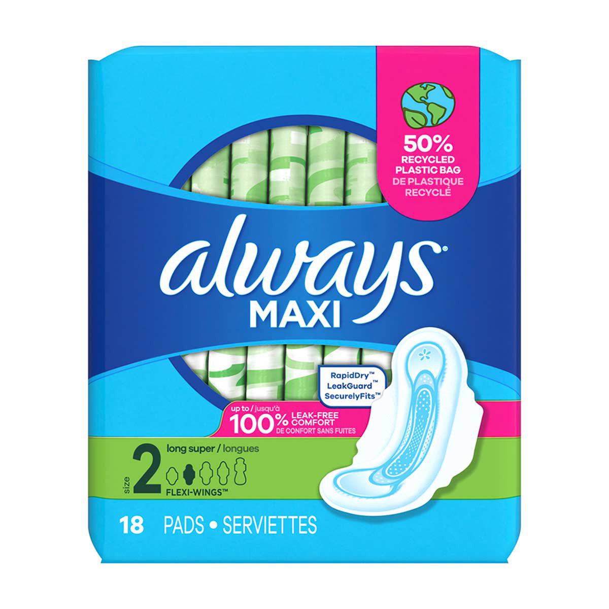 Always Maxi Pads with Wings, Size 2 Long Super, 18 ct