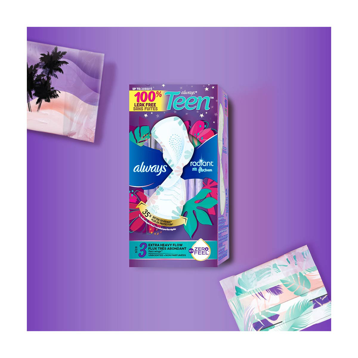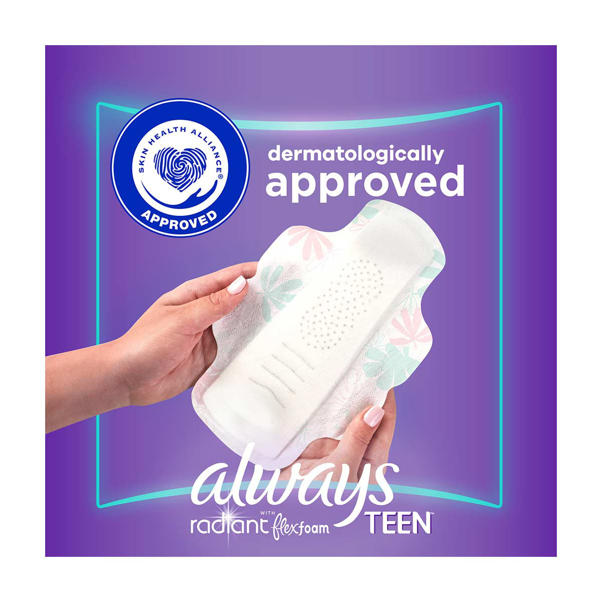 - ALWAYS RADIANT TEEN PRODUCTS FEATURE SOFT FLEXFOAM MATERIAL for all-day comfort and absorption