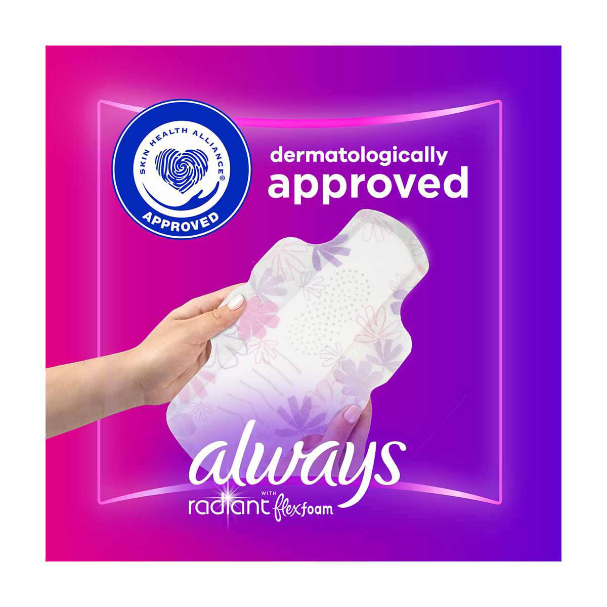 - Always Radiant pads made with Flex Foam give women up to 100% leak and odor-free protection