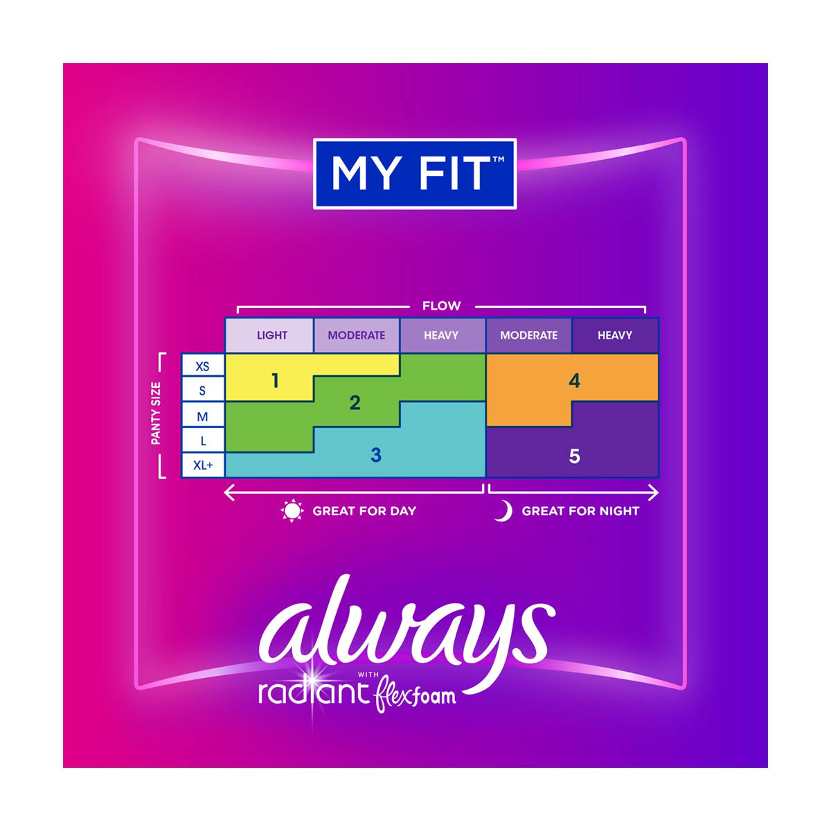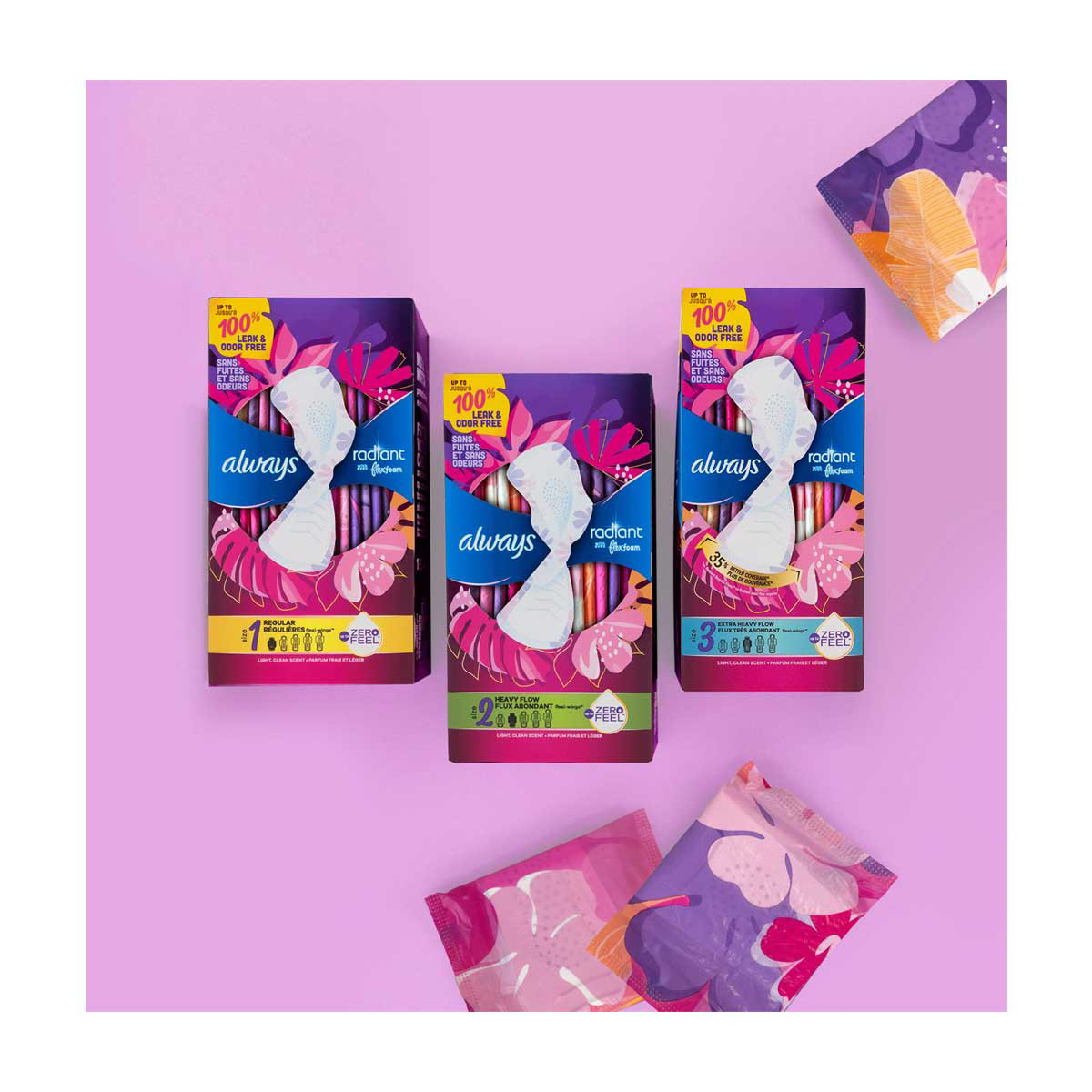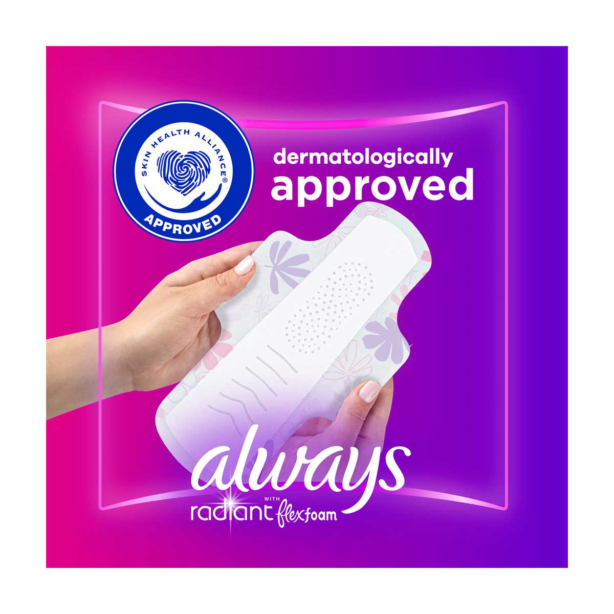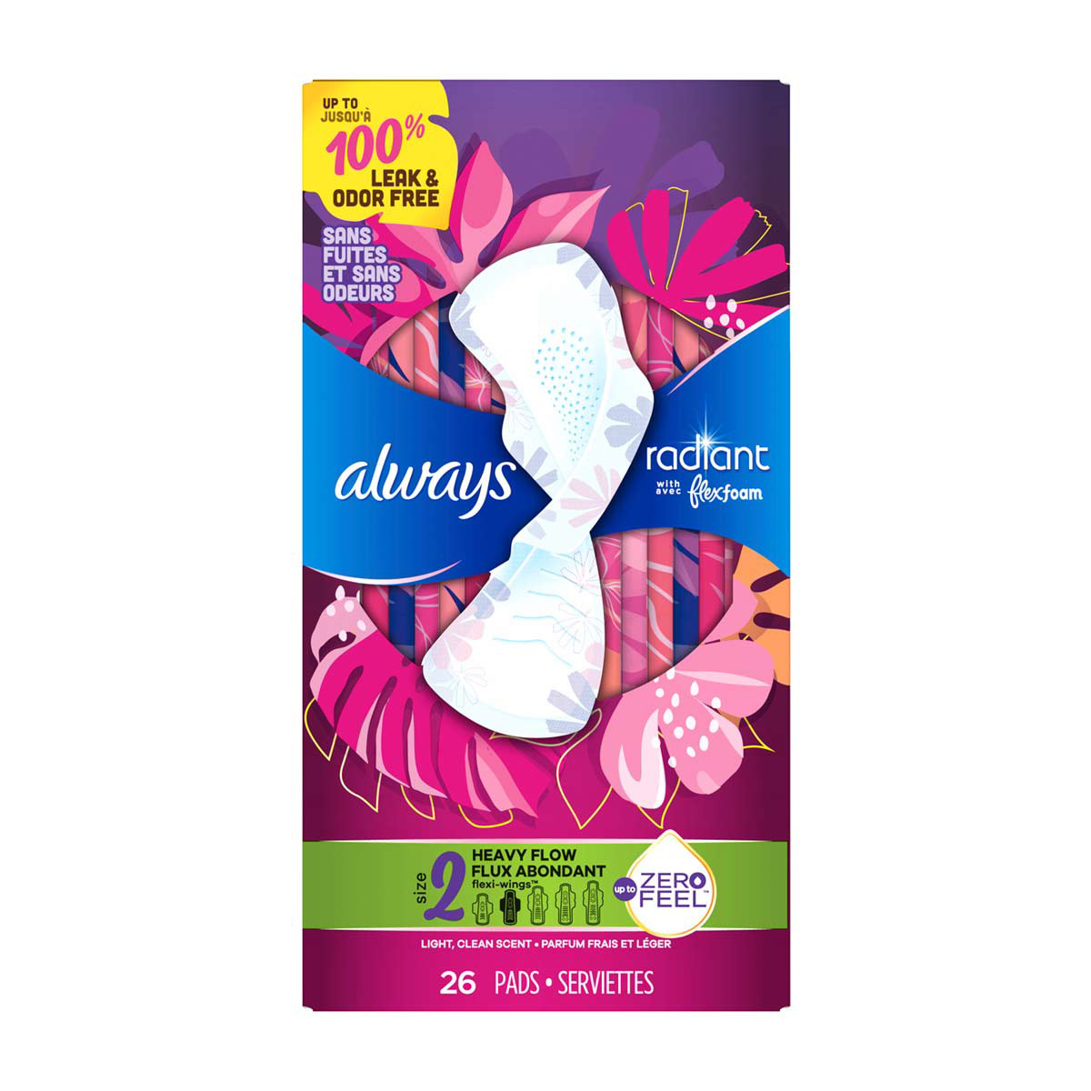 - Always Radiant pads made with FlexFoam give women up to 100% leak and odor-free protection