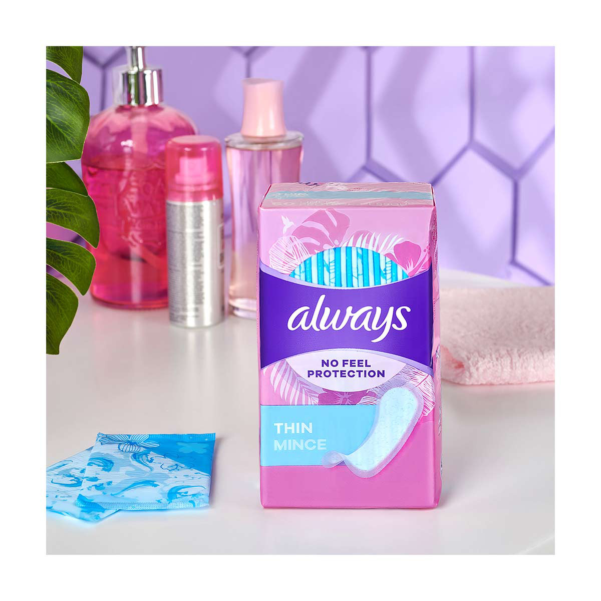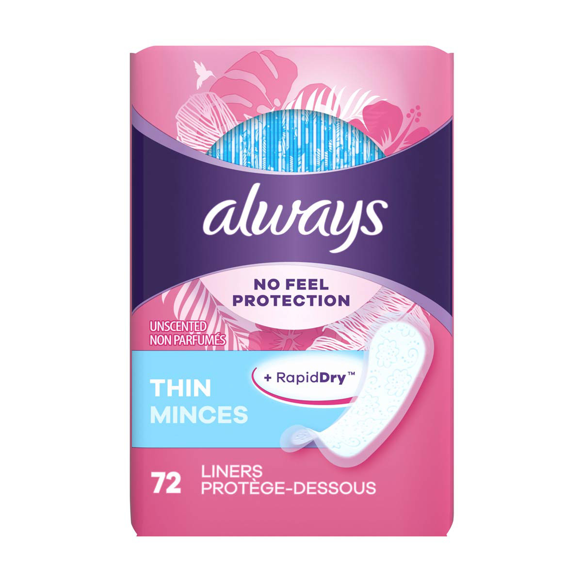 • Always Thin No Feel Protection Daily Liners, Regular Absorbency, Unscented, 72 Count