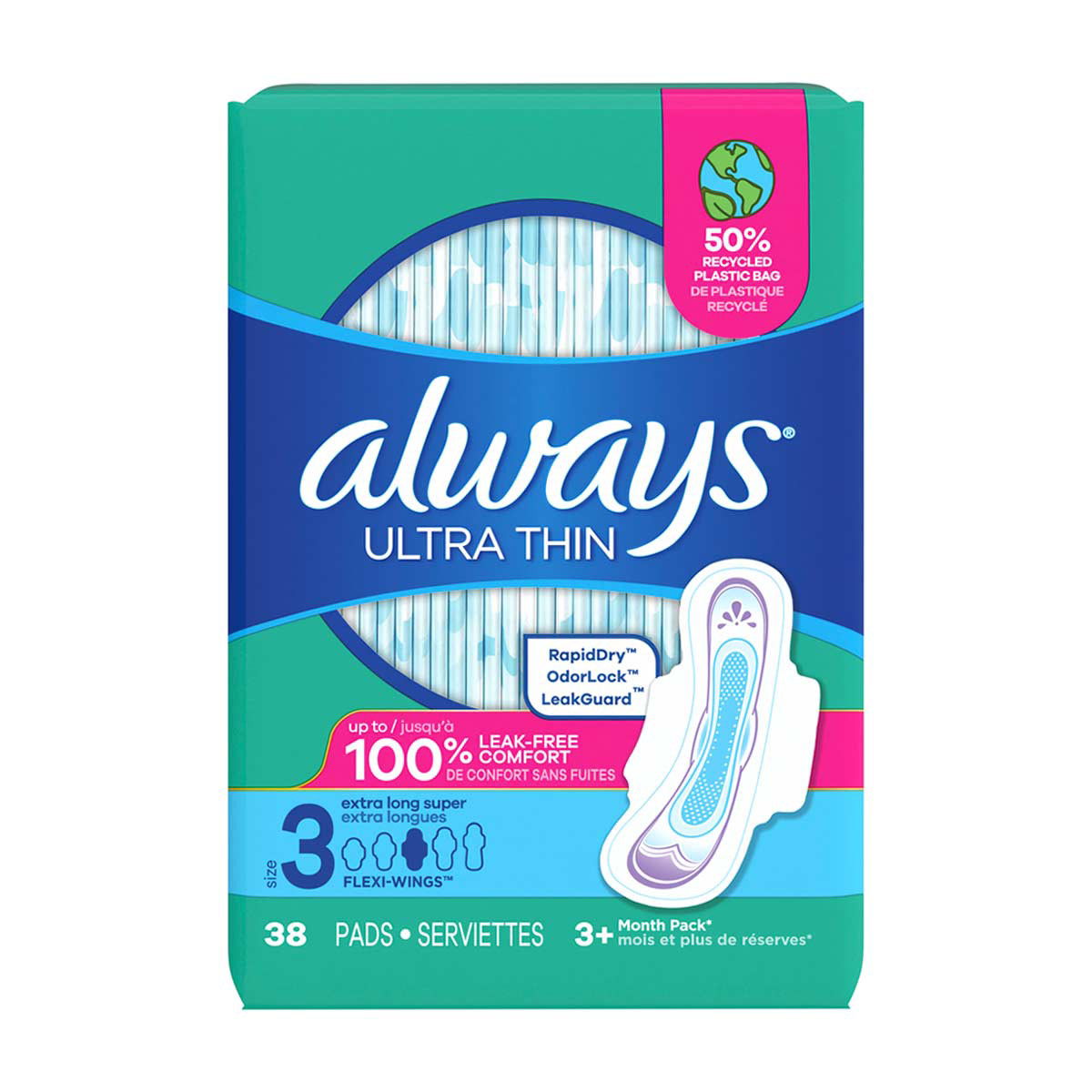 • Always Ultra Thin Feminine Pads with Wings for Women, Size 3, Extra Long Super Absorbency, Unscented, 38 Count