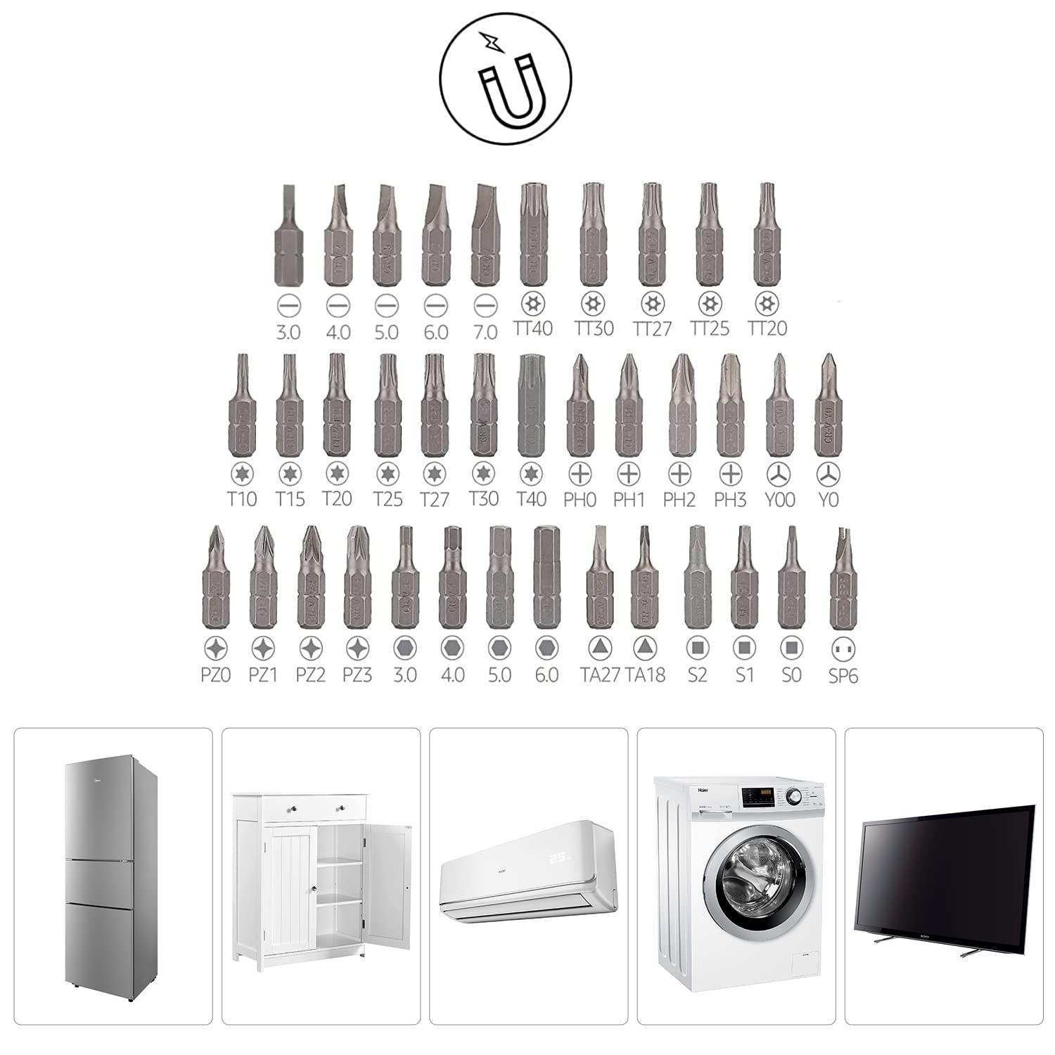 - 73-piece ratchet wrench and screwdriver set for easily tightening and loosening fasteners; the precision screwdriver bits are non-magnetic, which is suitable for small electronic instruments like watches, smartphones, glasses, and more; the other bits are magnetic, which is suitable for repairing popular electric appliances, like air conditioners, washing machines, refrigerators, TVs, and more