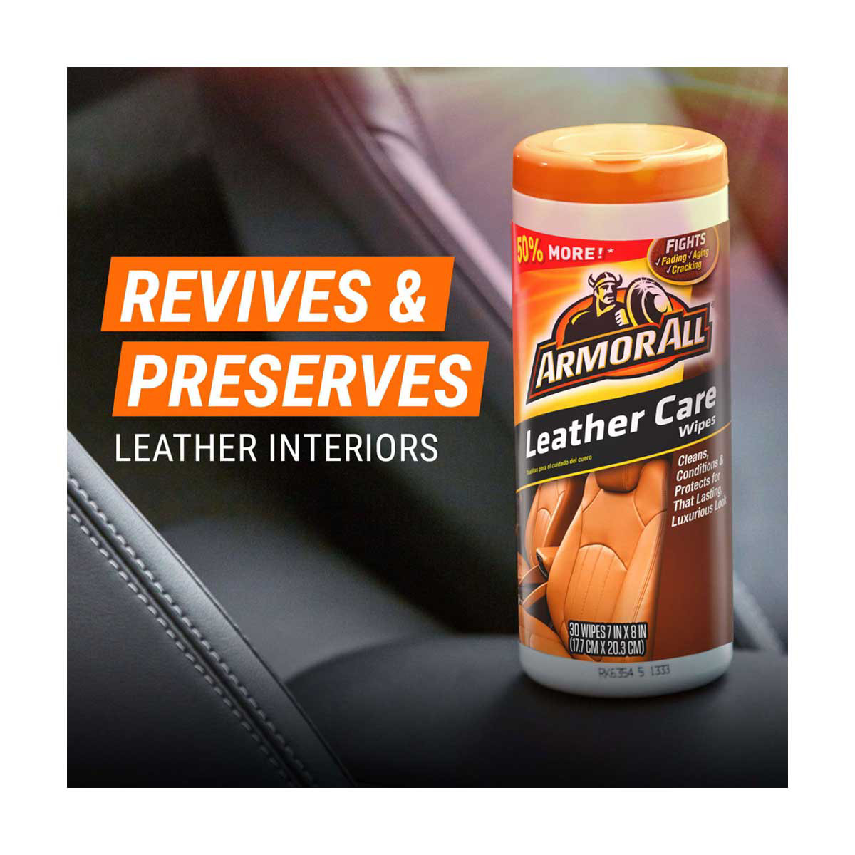 - One 30 count canister of Armor All Leather Care Wipes for cleaning, conditioning and protecting leather surfaces