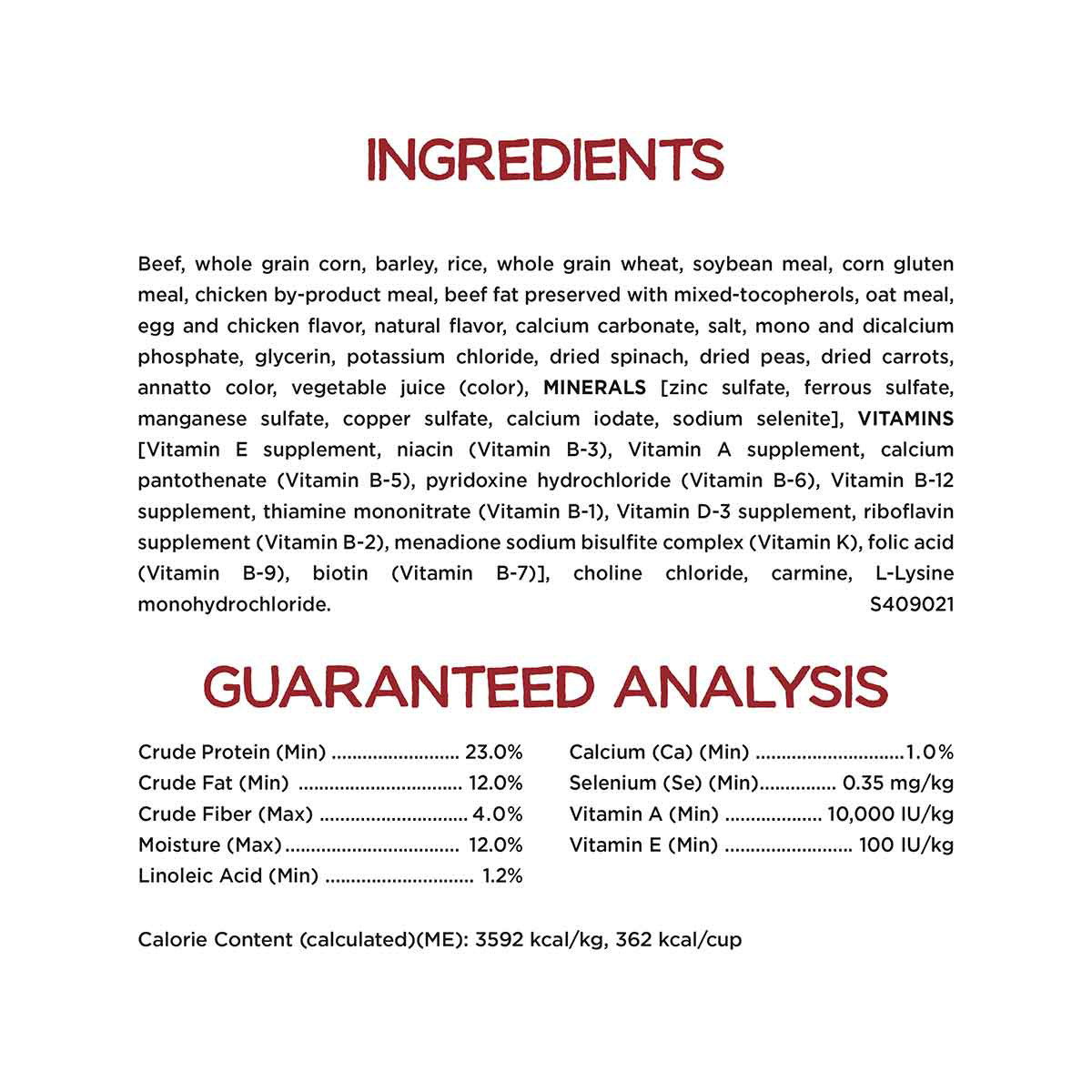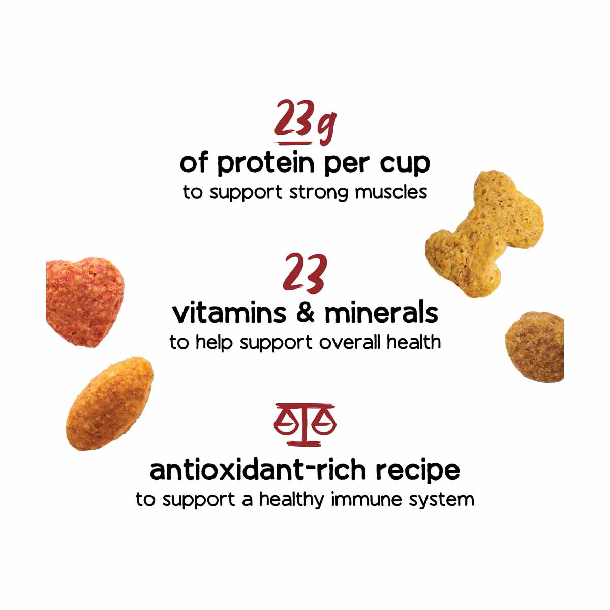 - This dog food with real meat contains 23g of protein per cup to help maintain dog muscle health