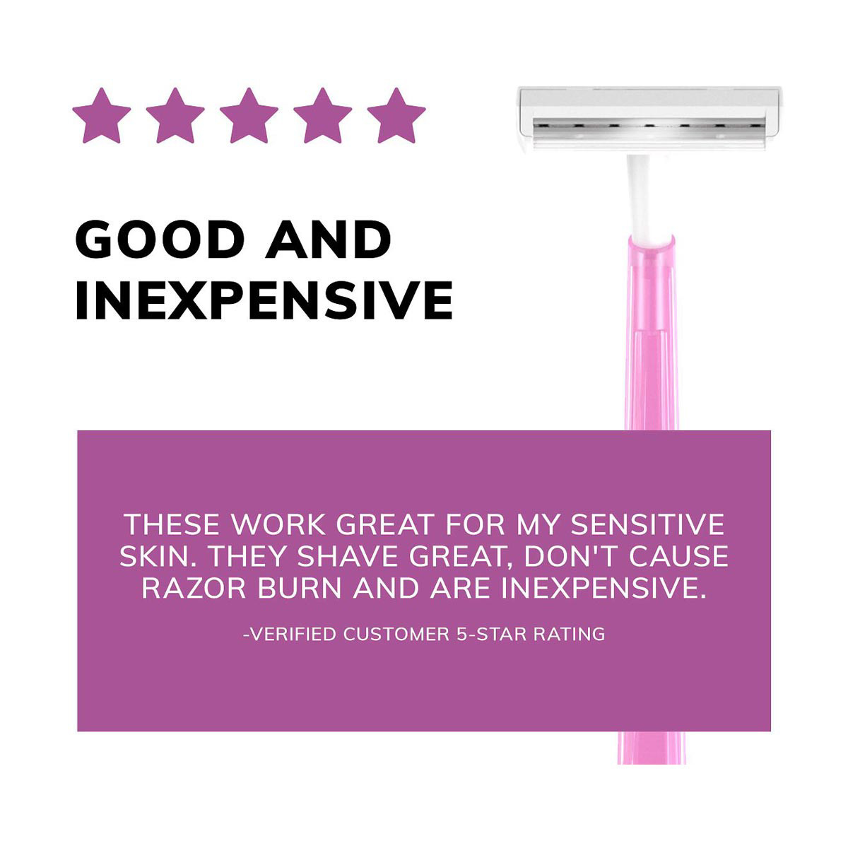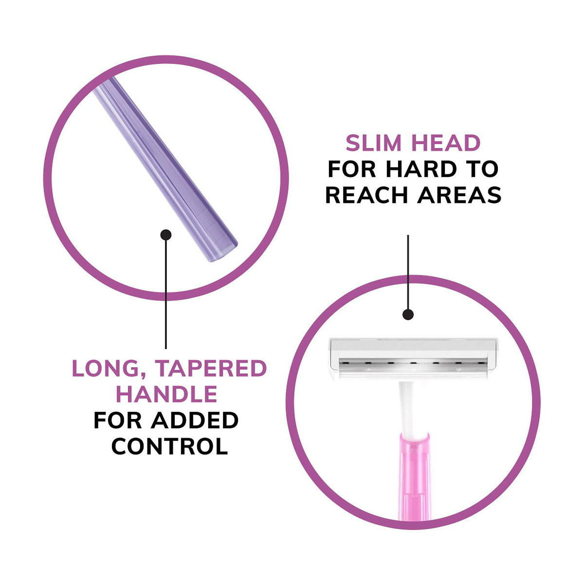 • Women's razors for shaving with two blades for a smooth shave on any budget, plus each shaver has a slim head for hard to reach areas and long, tapered handle for added confidence and control while shaving