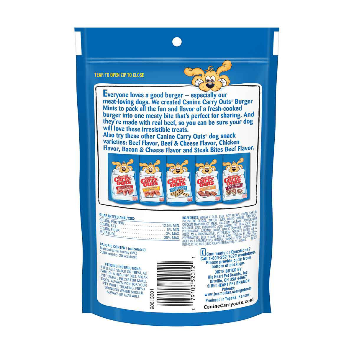• Contains one (1) 4.5-ounce bag of Canine Carry Outs Burger Minis Beef Flavor dog treats