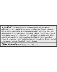 - Helianthus Annuus (Sunflower) Seed Oil, Jojoba Esters, Euphorbia Cerifera (Candelilla) Wax, Cocos Nucifera (Coconut) Oil, Caprylic/Capric Triglyceride, Beeswax, Copernicia Cerifera (Carnauba) Wax, Tocopheryl Acetate, Butyrospermum Parkii (Shea) Butter, Mangifera Indica (Mango) Seed Butter, Octyldodecanol, Persea Gratissima (Avocado) Oil, Olea Europaea (Olive) Fruit Oil, Flavor, Tocopherol, Hydrogenated Soybean Oil, Mentha Piperita (Peppermint) Oil, Rosmarinus Officinalis (Rosemary) Leaf Oil, Rubus Idaeus (Raspberry) Seed Oil, Glyceryl Stearate.