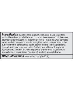 - Helianthus Annuus (Sunflower) Seed Oil, Jojoba Esters, Euphorbia Cerifera (Candelilla) Wax, Cocos Nucifera (Coconut) Oil, Caprylic/Capric Triglyceride, Beeswax, Copernicia Cerifera (Carnauba) Wax, Tocopheryl Acetate, Butyrospermum Parkii (Shea) Butter, Mangifera Indica (Mango) Seed Butter, Octyldodecanol, Persea Gratissima (Avocado) Oil, Olea Europaea (Olive) Fruit Oil, Flavor, Tocopherol, Hydrogenated Soybean Oil, Mentha Piperita (Peppermint) Oil, Rosmarinus Officinalis (Rosemary) Leaf Oil, Rubus Idaeus (Raspberry) Seed Oil, Glyceryl Stearate.