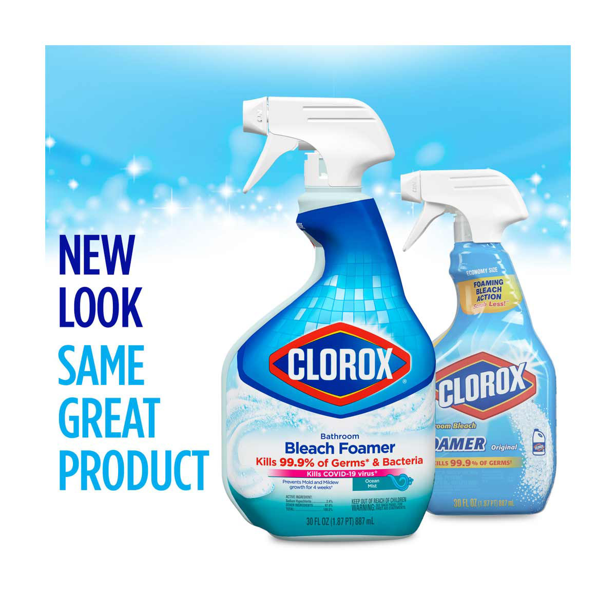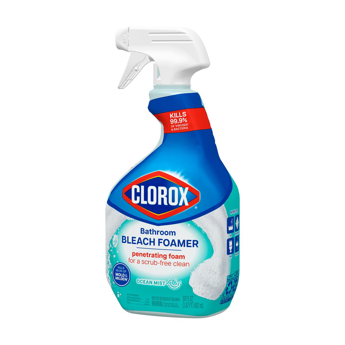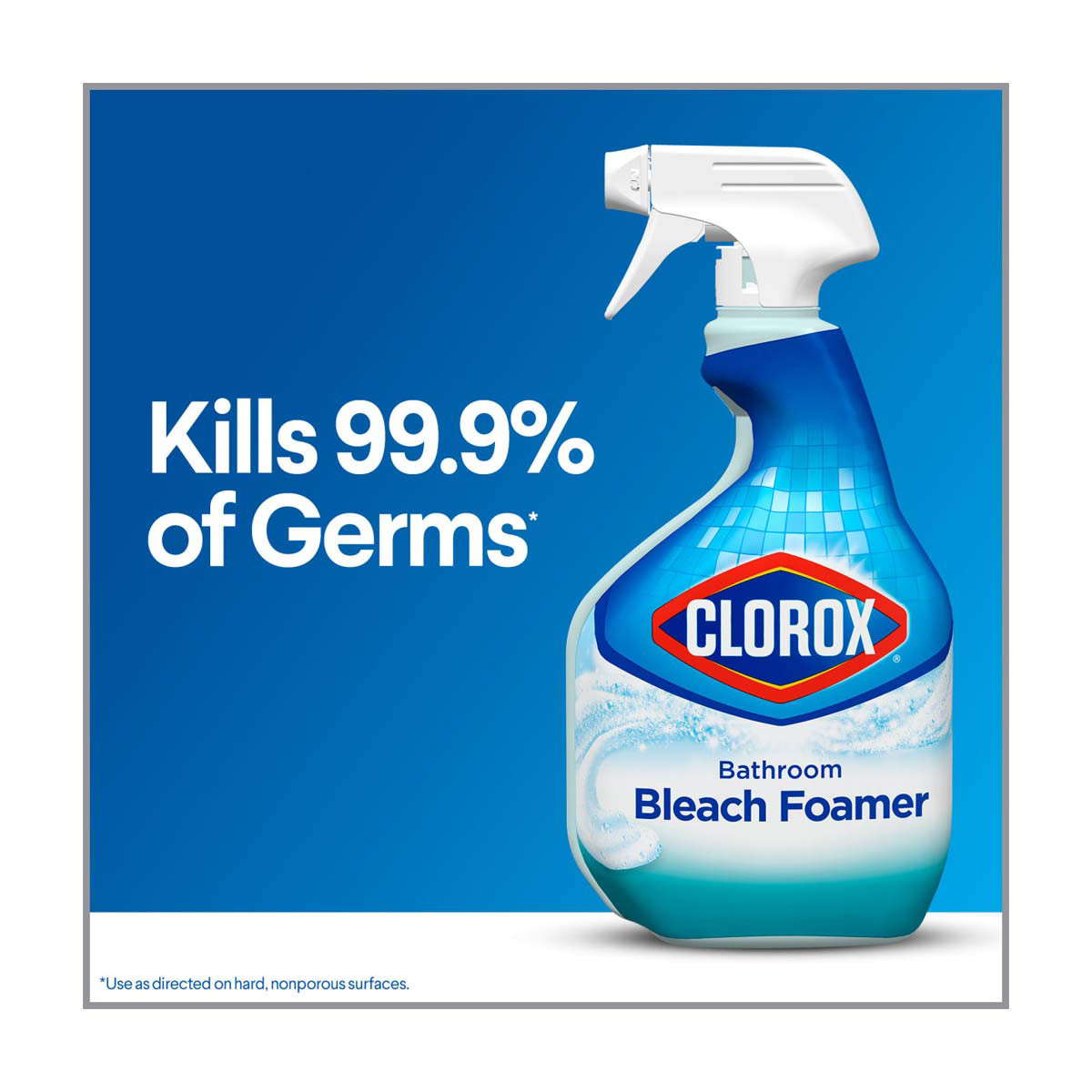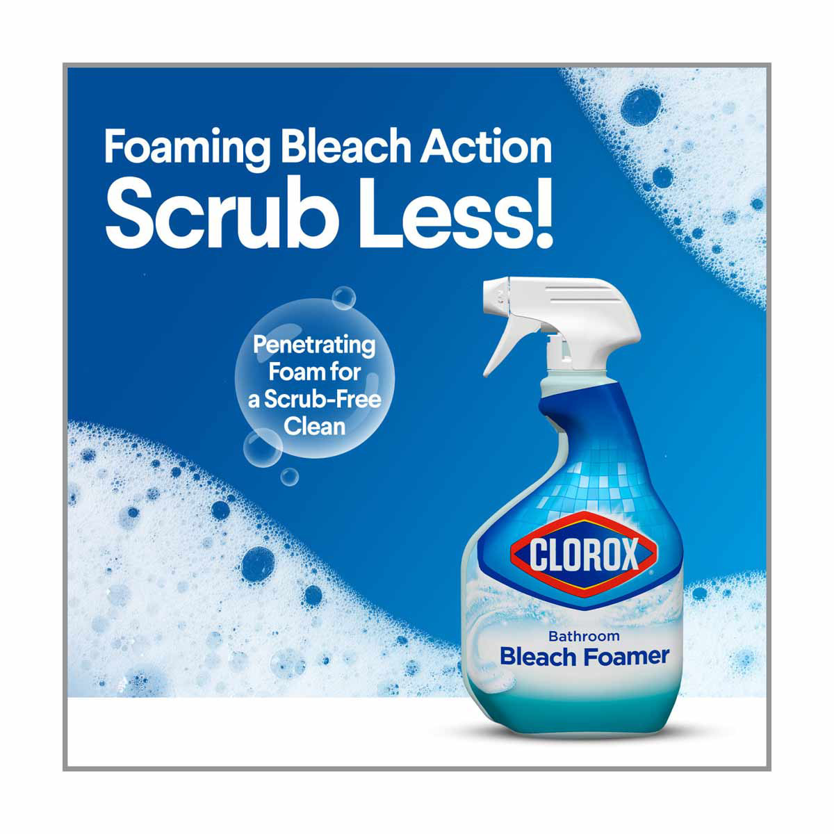 - BATHROOM CLEANER: Clorox® Bleach Foamer Bathroom Spray tackles stains on most bathroom surfaces as the foam penetrates and removes soap scum, dirt and grime