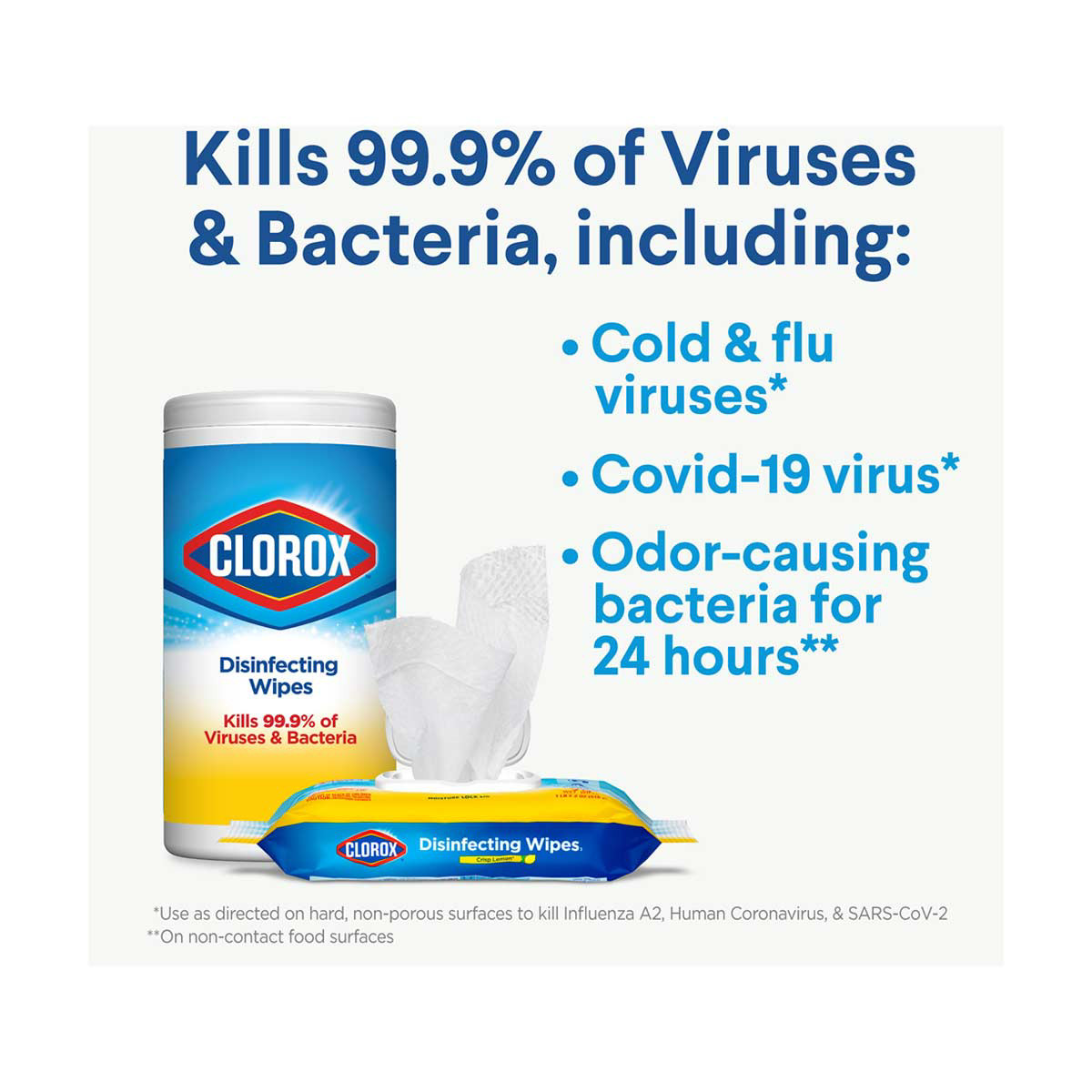 - DISINFECTING WIPES: Clorox® Disinfecting Wipes are proven to kill COVID 19 Virus* in 15 seconds; cleans and kills 99.9% of viruses and bacteria