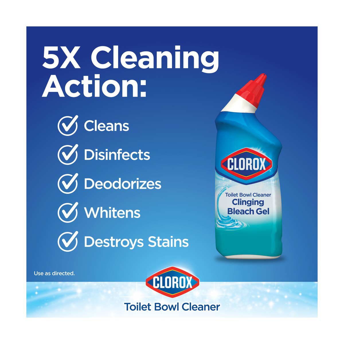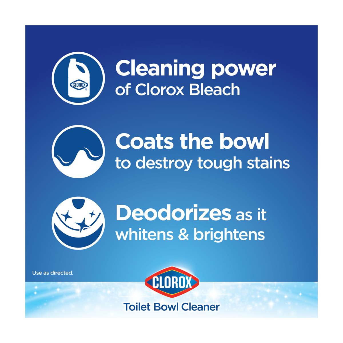 • Clorox‚Ñ¢ TOILET CLEANER: The only Toilet Bowl Cleaner with Clorox‚Ñ¢ Bleach, in a uniquely angled nozzle that let‚Äôs you easily target hard to reach areas for the best toilet bowl coverage