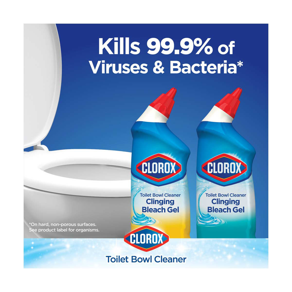 • BLEACH TOILET BOWL CLEANER: Kills 99.9% of germs, inlcuding the COVID-19 Virus*, and whitens and brightens your toilet bowl with the power of Clorox‚Ñ¢ Bleach and leaves a refreshing Rain Clean¬Æ Scent; Package may vary