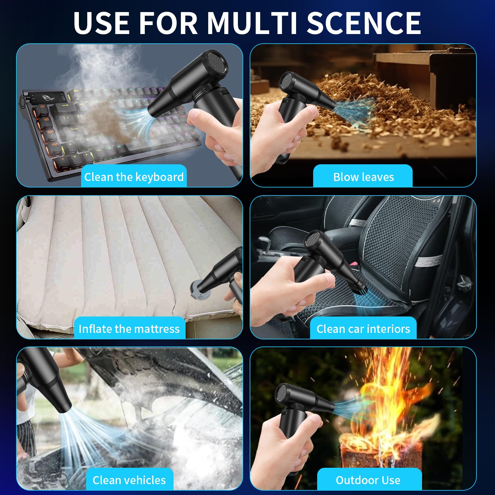- 【Wide Application】: The electric air duster comes with 3 nozzles and 3 brushes, making it suitable for a variety of scenes, such as cleaning pc, keyboards, or other electronic devices. In addition to a home cleaning kit and car duster, it also serves well for outdoor activities such as inflating and outdoor fires.