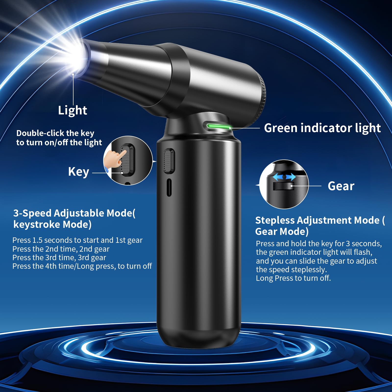 - 【Super Power Turbo Fan】: AEDNX X20 compressed air duster reaches speeds of up to 300,000 RPM, delivering a maximum wind speed of 120m/s. This allows it to effectively clear dust and debris. The electric air duster also features 3-speed adjustable speed mode and stepless speed adjustment mode to cater to various cleaning needs.