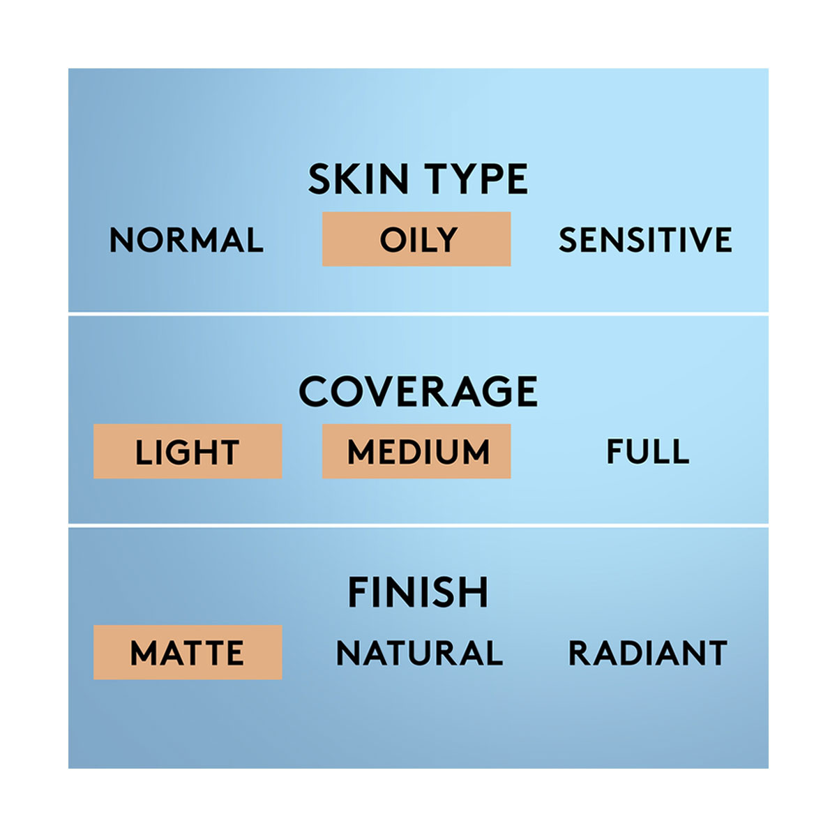- Oil-free, lightweight formula designed to control shine and provide a fresh matte finish for oily skin