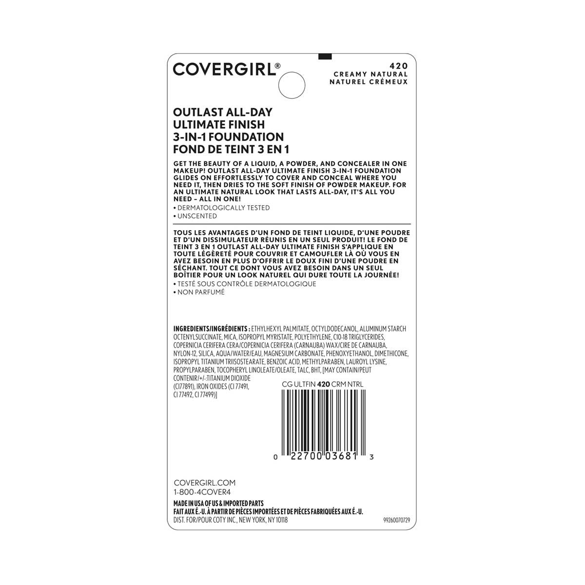 • CoverGirl Outlast All-Day Ultimate Finish 3-in-1 Foundation, 420 Creamy Natural, 0.4 oz