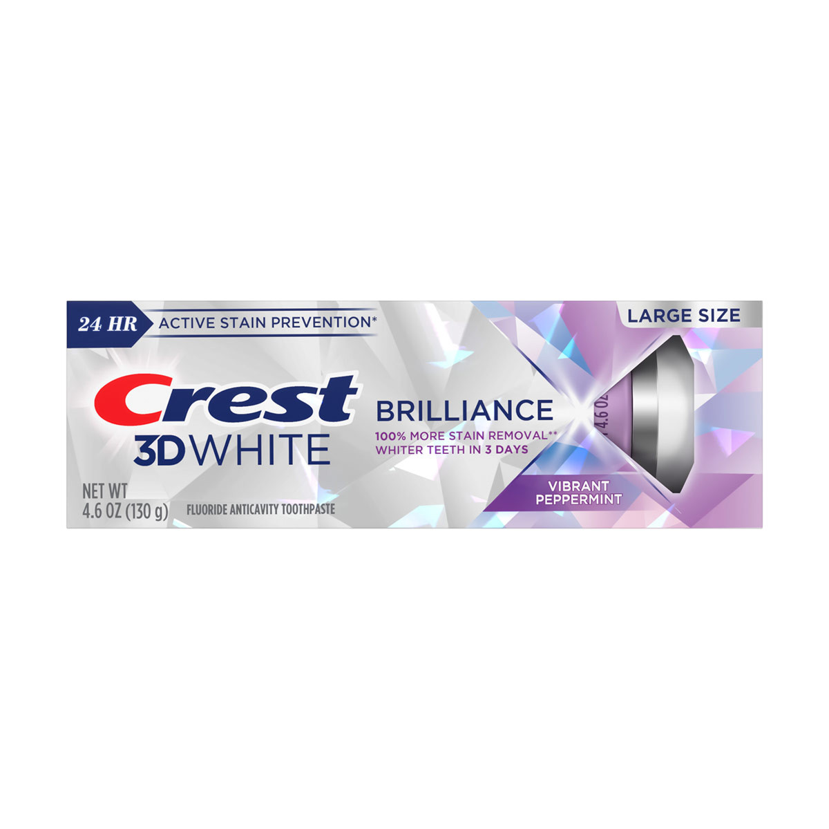 • Receive one 4.6 oz tube of Crest 3D White Brilliance Toothpaste in Vibrant Peppermint Flavor