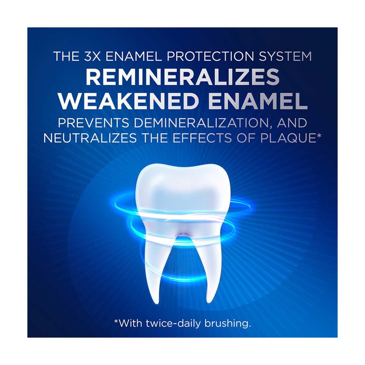 - The 3X Enamel Protection System remineralizes weakened enamel, prevents demineralization, and neutralizes the effects of plaque** **With twice-daily brushing.