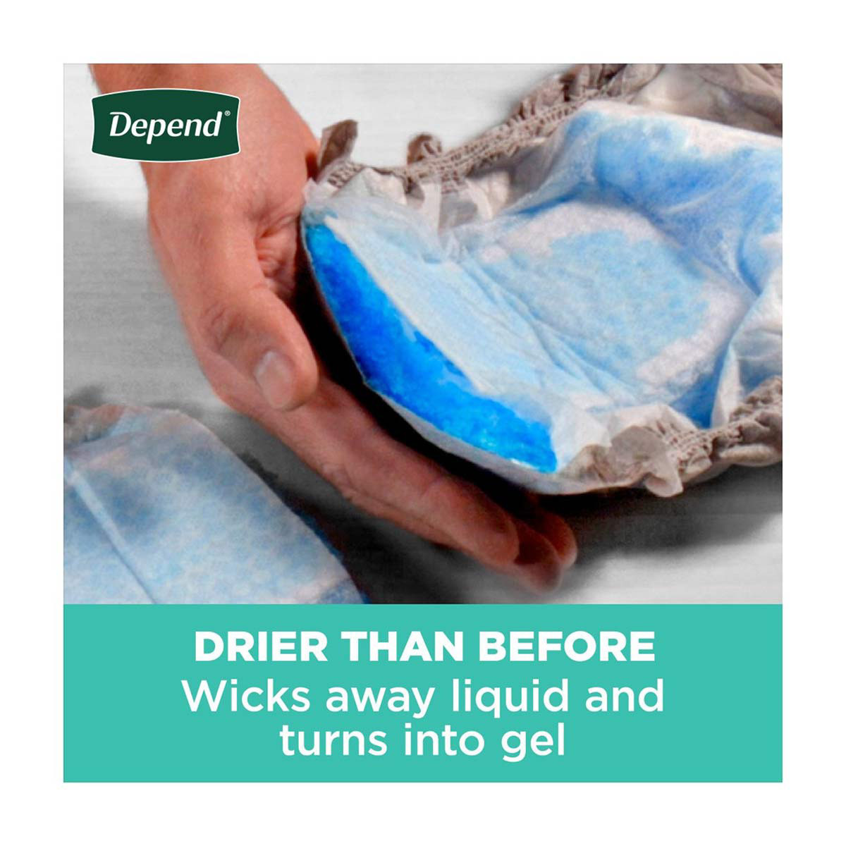 - 2x Drier Than Before: Depend’s improved liner wicks wetness away from your skin to help keep you dry all day