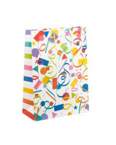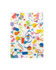 • Available in assorted designs: large multi-color dots with red background & confetti bag with multi-color shapes