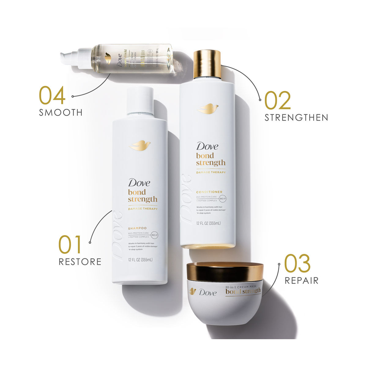 - ULTRA STRENGTH & SMOOTHNESS: Dove Bond Strength Shampoo & Conditioner system strengthens bonds from inside out and helps reverse signs of accumulated damage for ultra strength and smoothness.
