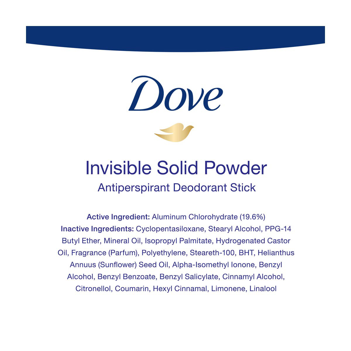• Dove Invisible Solid Powder Antiperspirant Deodorant Stick provides all day underarm sweat & odor protection