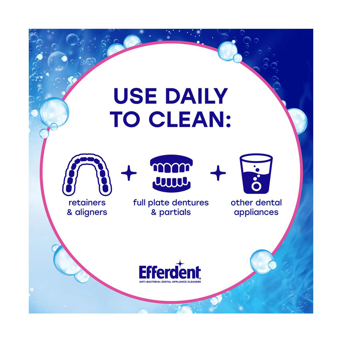 - Use Efferdent retainer cleaner tablets daily to clean retainers, full-plate dentures, partials, aligners and other dental appliances
