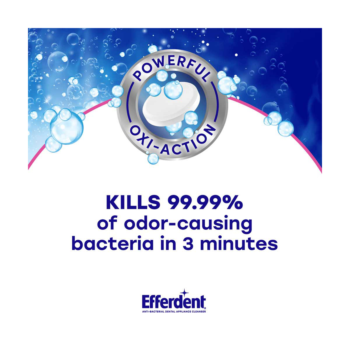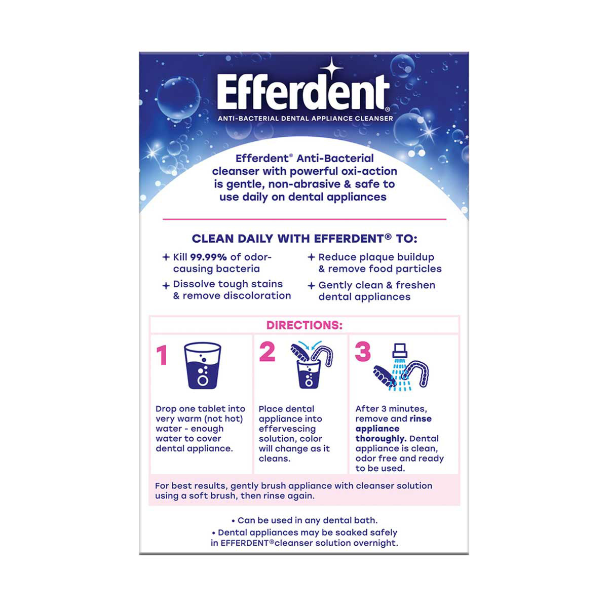 - Efferdent Complete Clean antibacterial cleaner tablets provide an everyday, odor-free clean