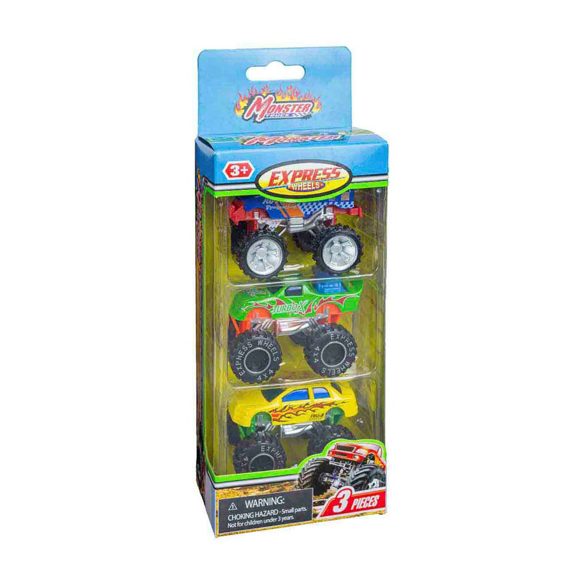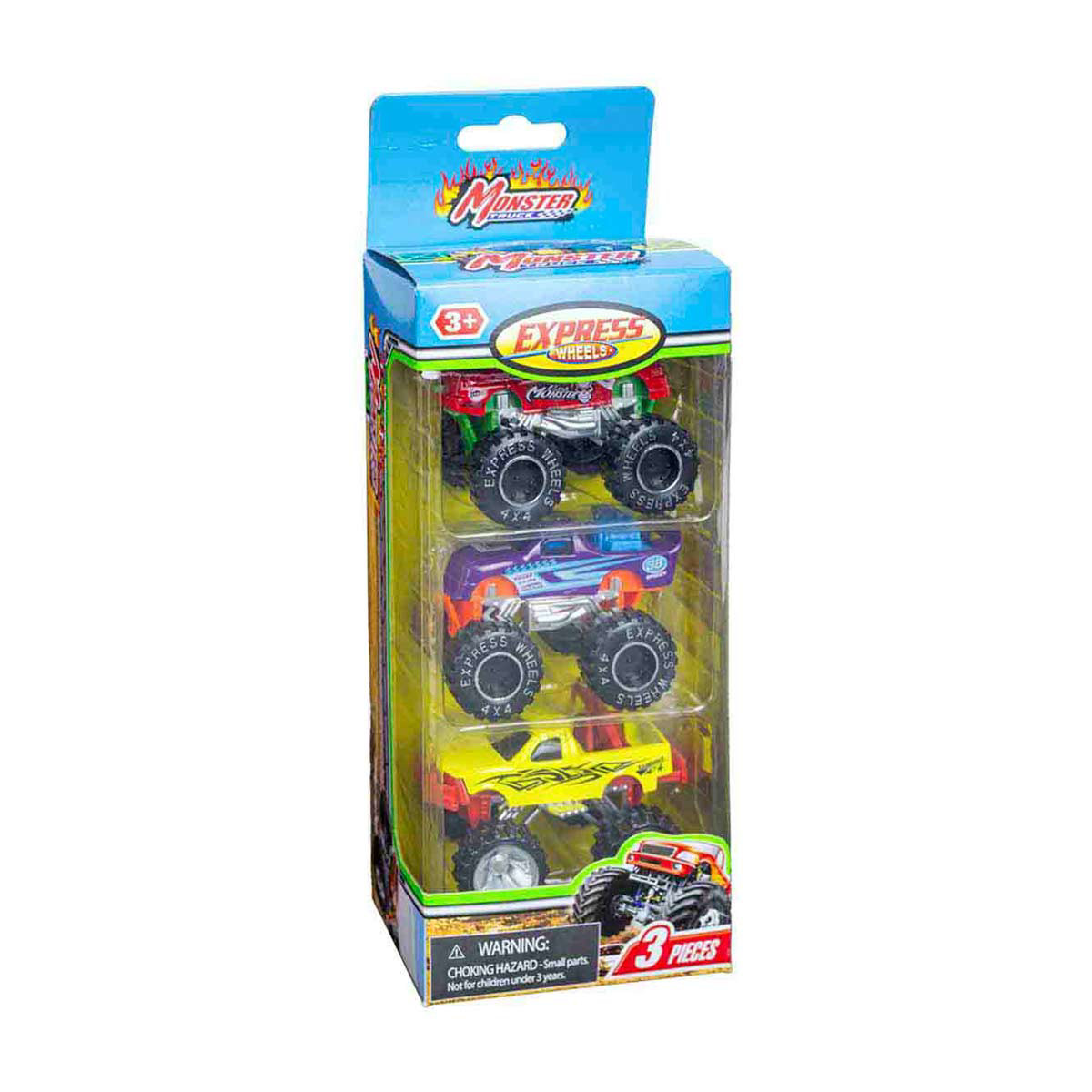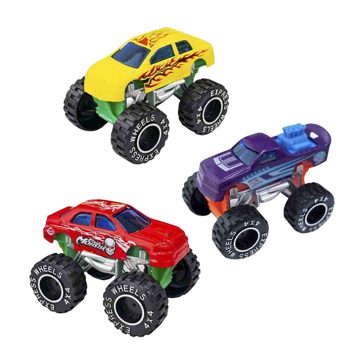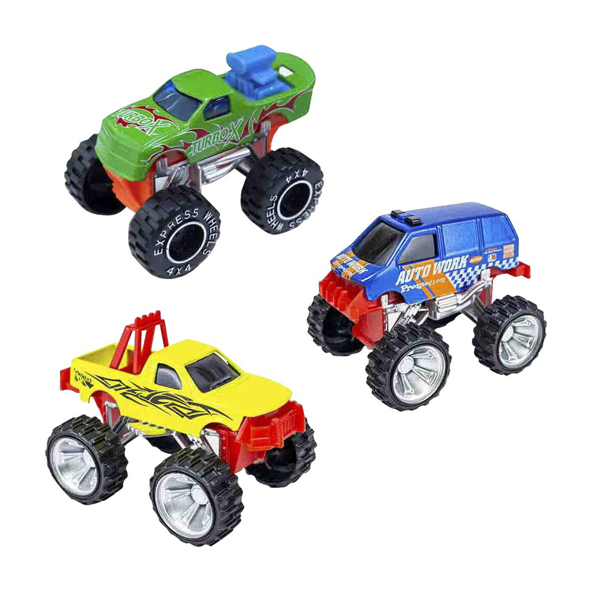 • Each set includes 3 pc decorated die cast Monster Truck.