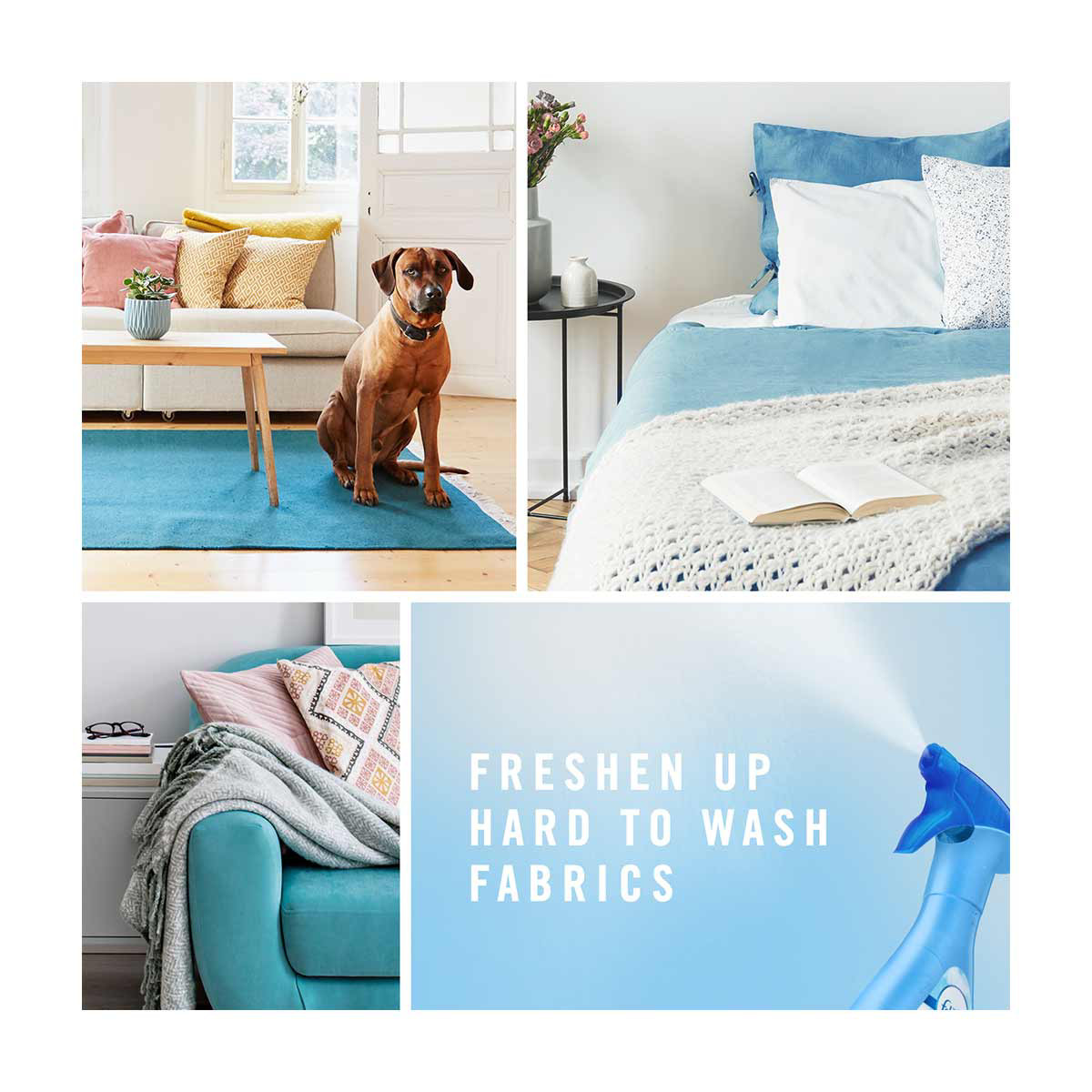 • Spray until fabric is damp, let dry, and enjoy freshness all around your home