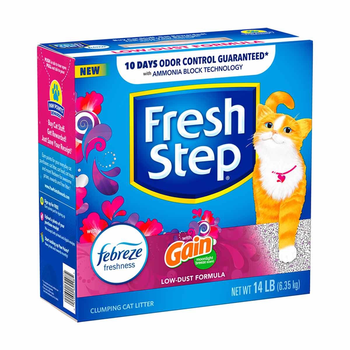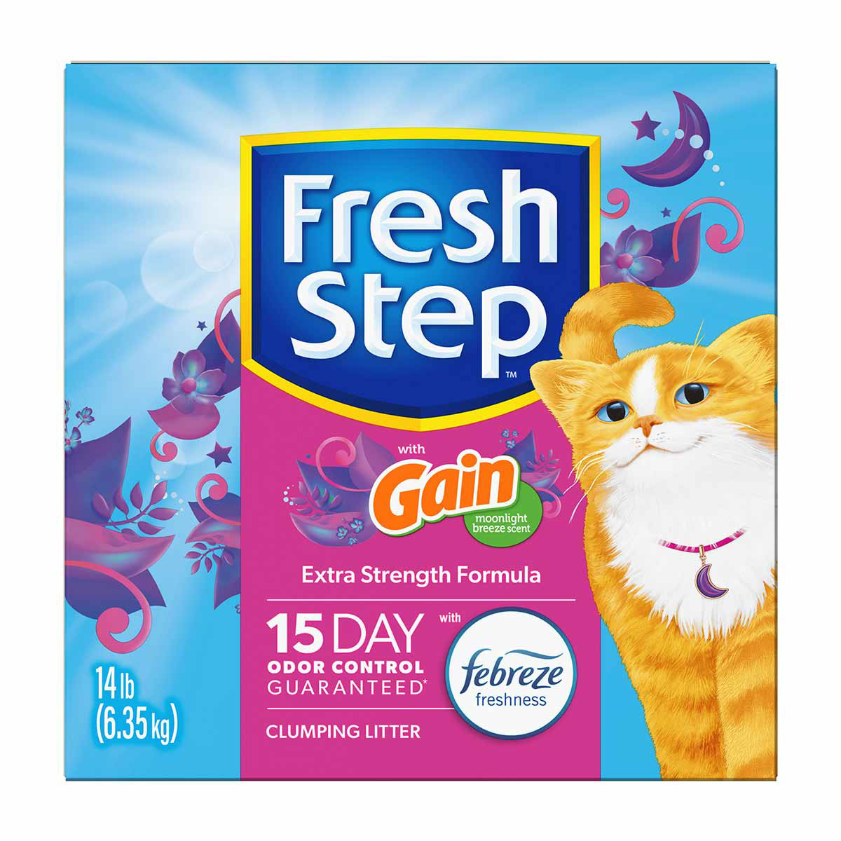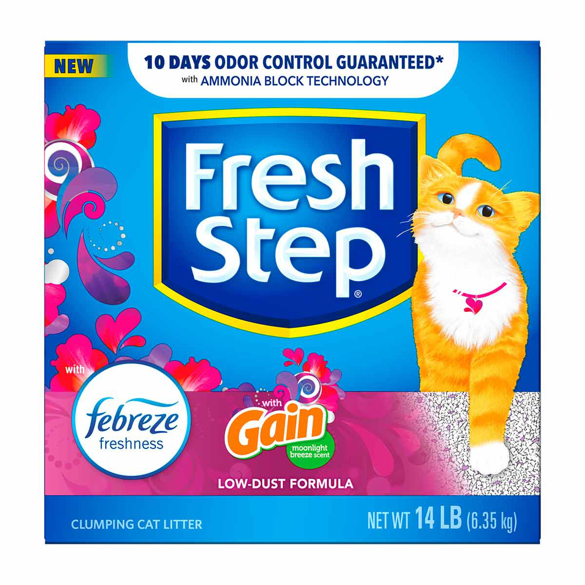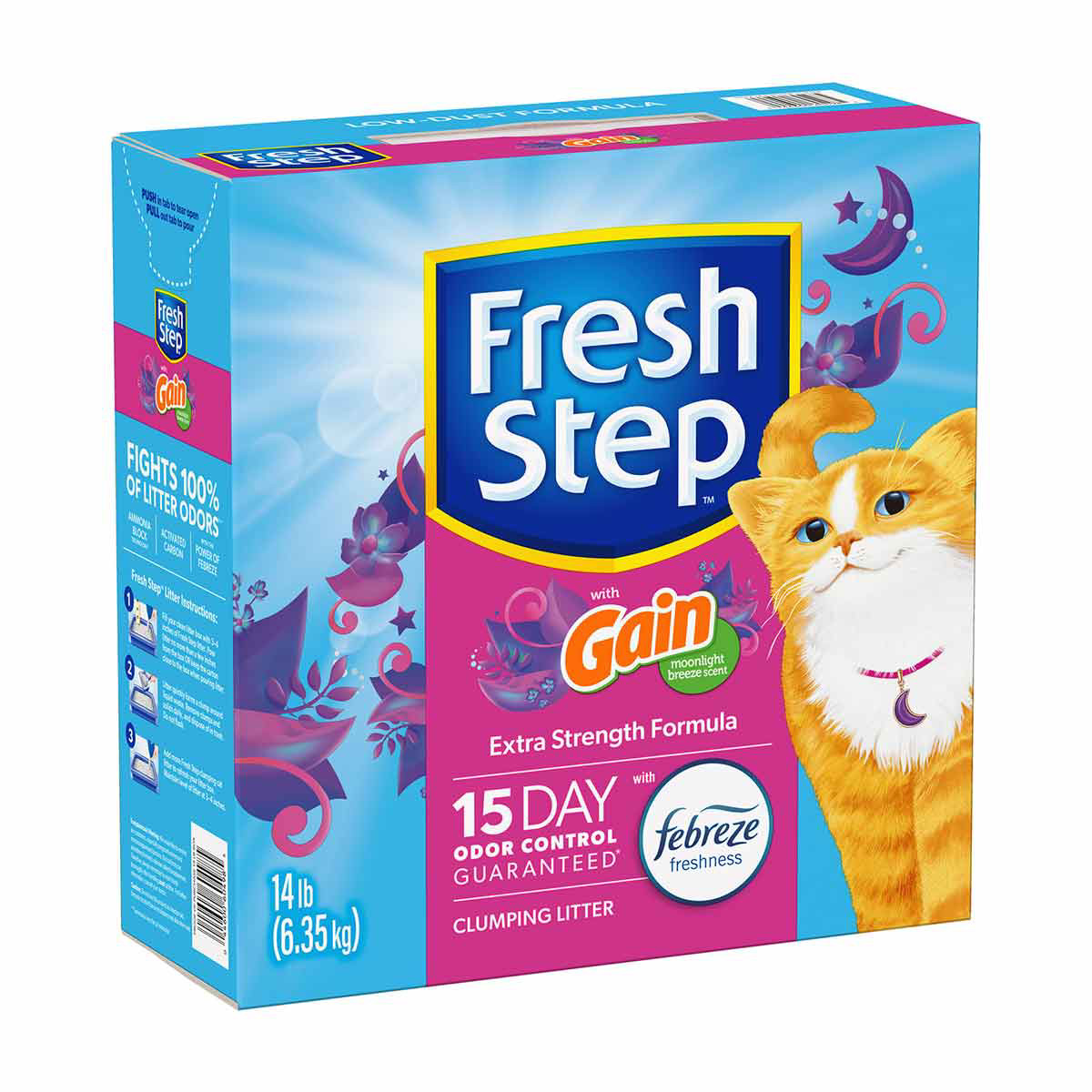 - CLUMPING CAT LITTER: One 14-lb. box of Fresh Step Clumping Litter with Febreze freshness with Gain Moonlight Breeze scent, activated charcoal kitty litter that keeps litter boxes smelling fresh