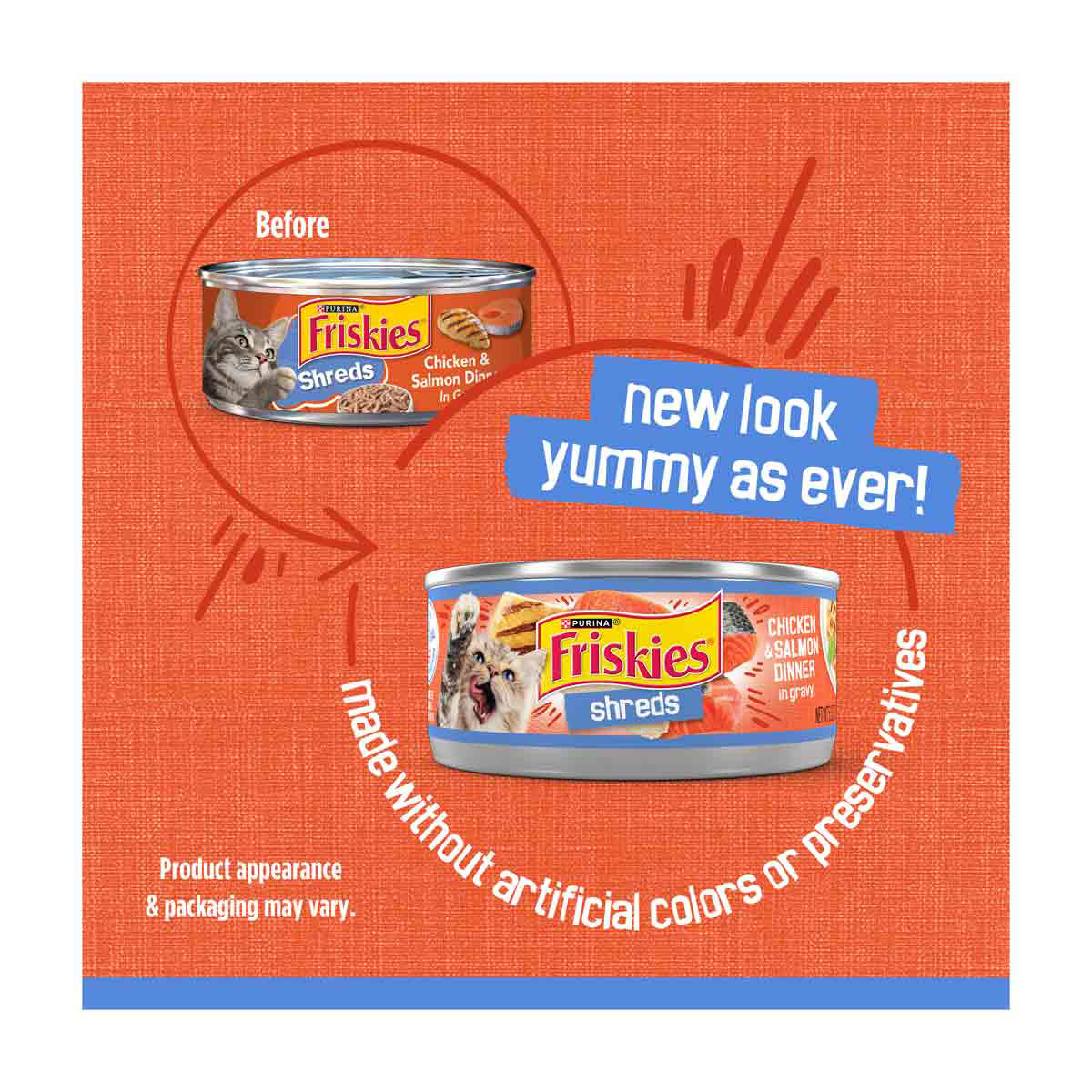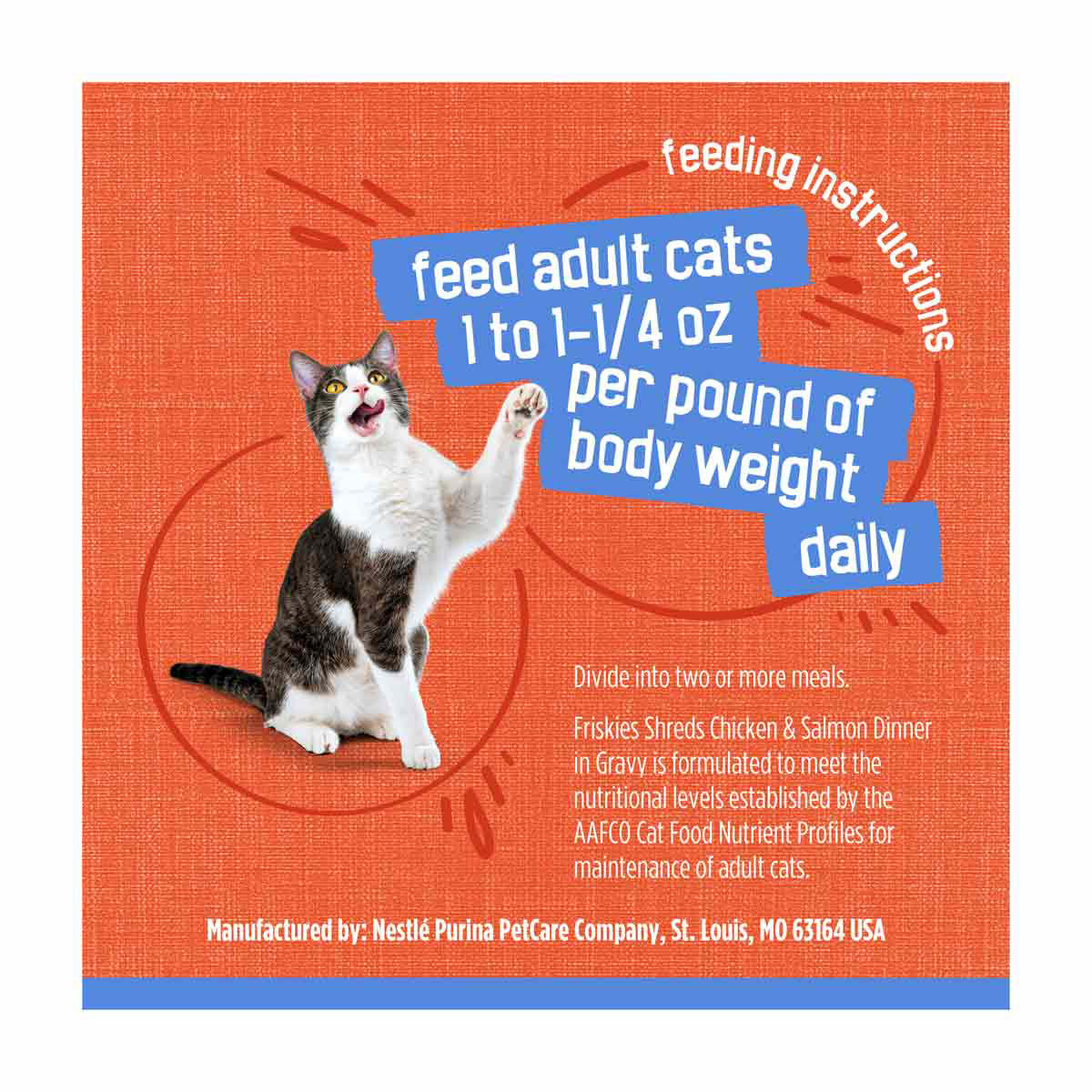 - Purina Friskies Shreds canned cat food containing essential vitamins and minerals. Proudly produced in Purina-owned U.S. facilities