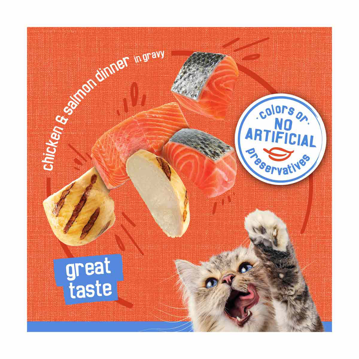 - With real chicken and salmon for the taste cats love. Savory gravy for cats adds moisture and flavor