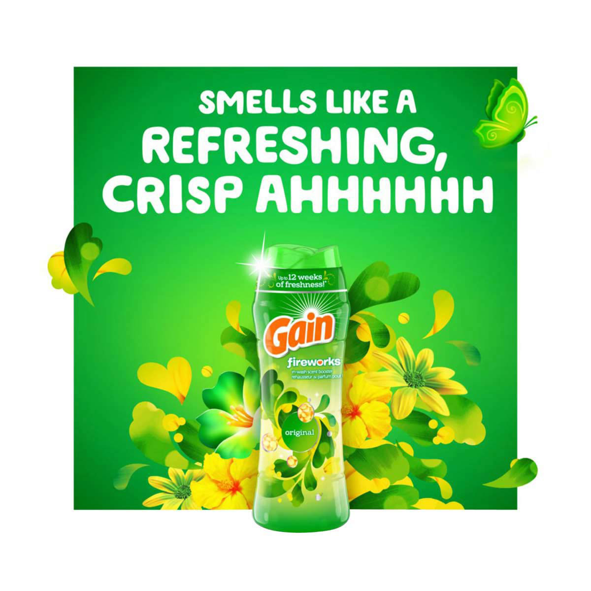 - Gain Fireworks In-Wash Scent Booster gives your laundry up to 12 weeks of freshness, from wash until wear.