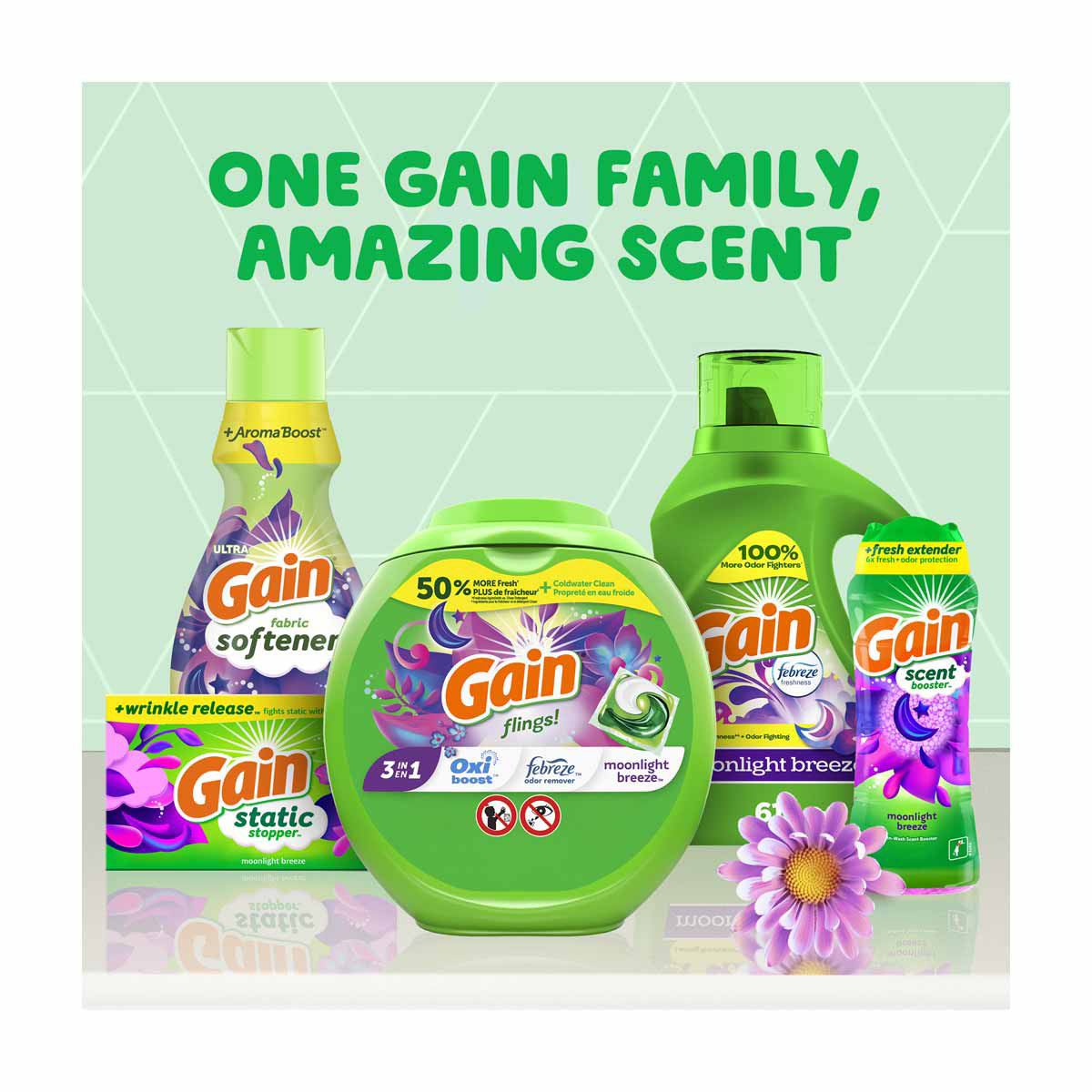 - LOOONG-LASTING: Gain Liquid Laundry Detergent Moonlight Breeze Scent capsules break for scent that continues to release during regular wear for lasting freshness for up to 6 weeks from wash until wear
