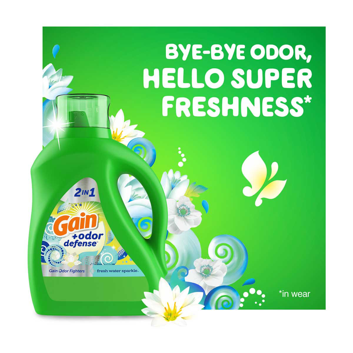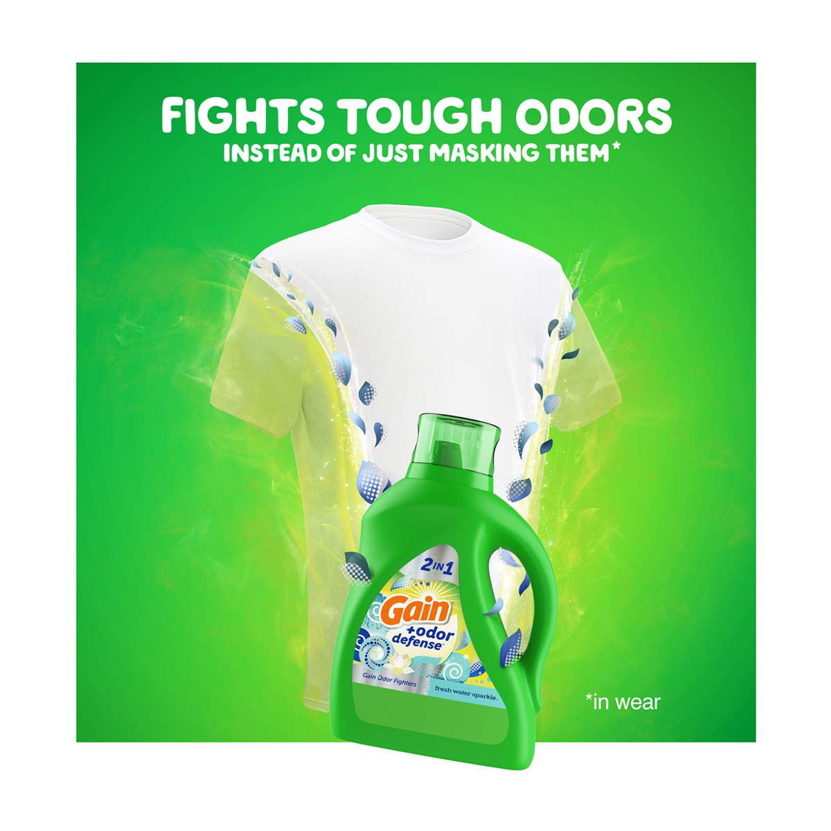 • Gain + Odor Defense Liquid Laundry Detergent, Fresh Water Sparkle Scent, 45 Loads, HE Compatible