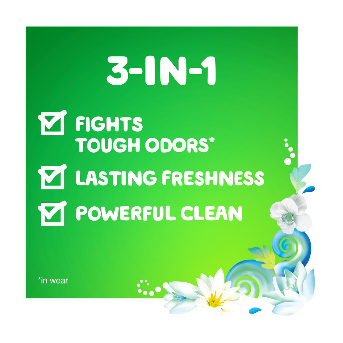 • 3-in-1 detergent: Eliminates tough odors in-wear while giving your clothes a powerful clean and lasting freshness