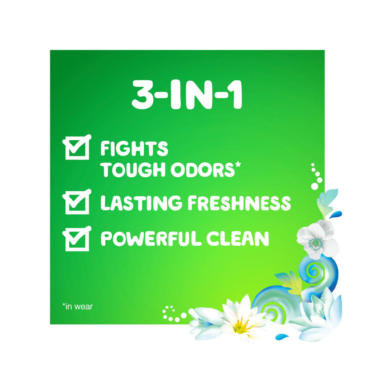 • 3-in-1 detergent: Eliminates tough odors in-wear while giving your clothes a powerful clean and lasting freshness