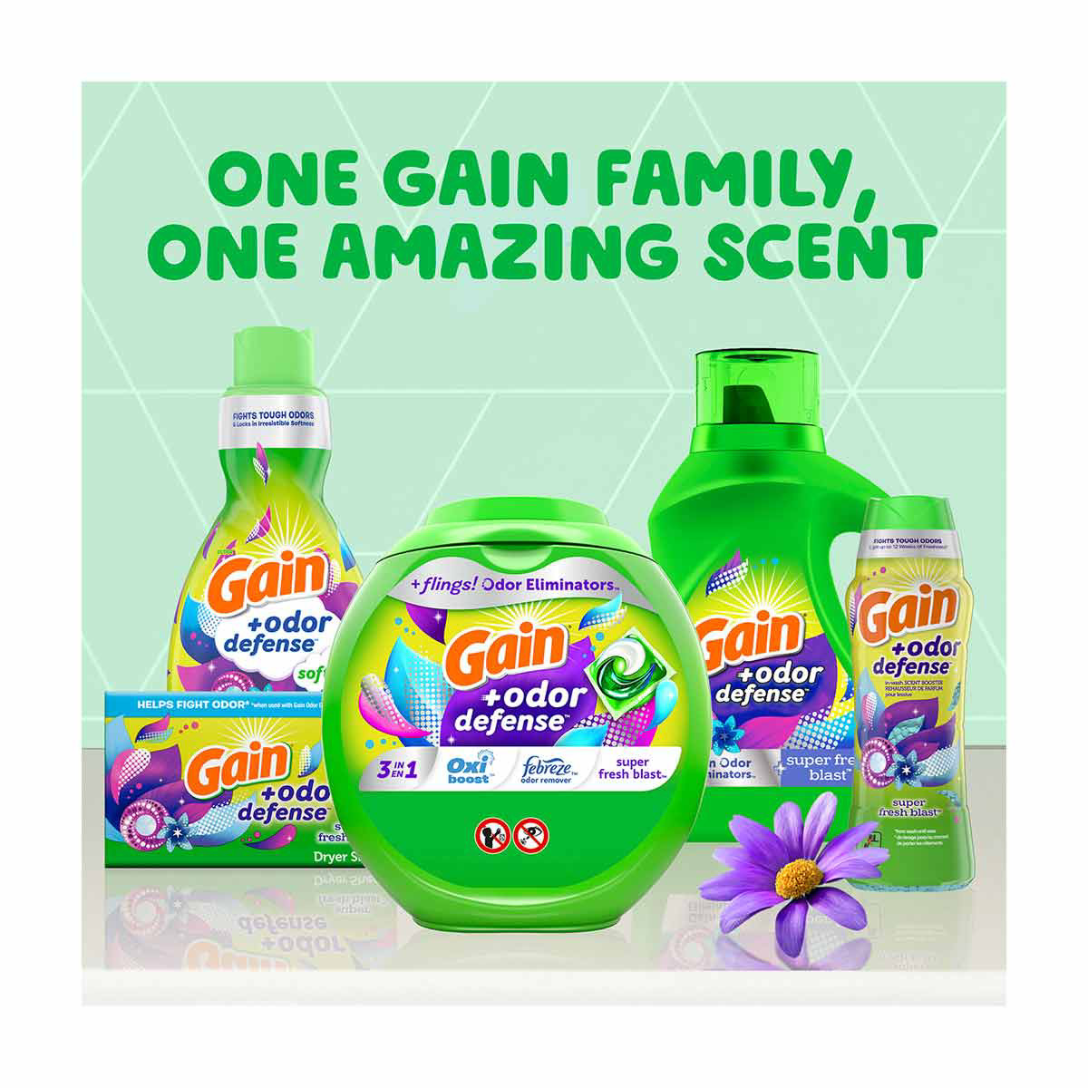 • LOOONG-LASTING: Gain Odor Defense Liquid Laundry Detergent Super Fresh Blast Scent capsules break for scent that continues to release during regular wear for lasting freshness for up to 6 weeks from wash until wear